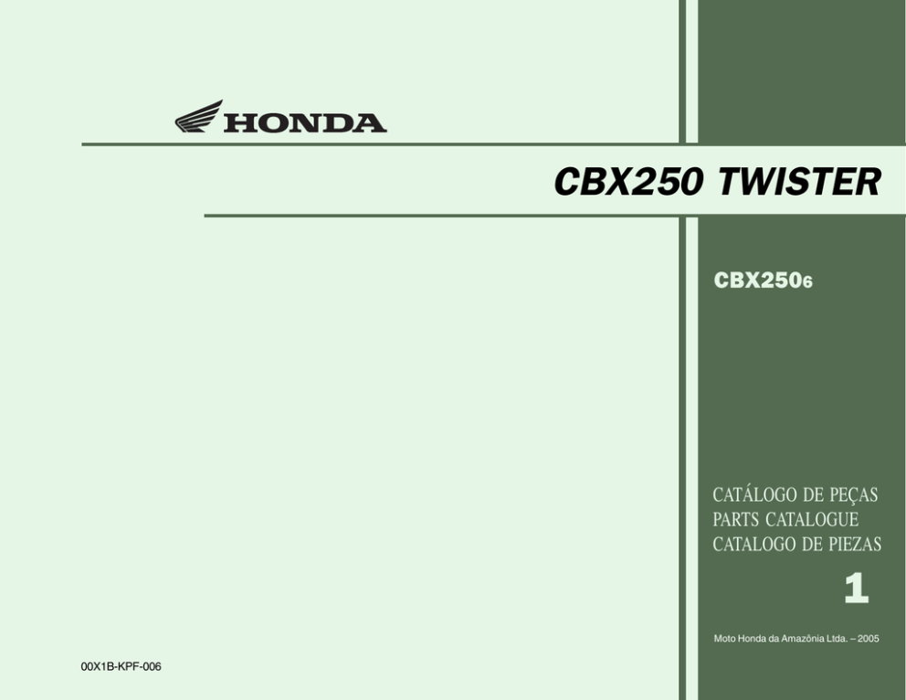 CBX250 TWISTER CBX2506 CATÁLOGO DE PEÇAS PARTS CATALOGUE CATALOGO DE PIEZAS 1 Moto Honda da Amazônia Ltda. – 2005 00X1B-KPF-006 ÍNDICE INDEX INDICE INSTRUÇÕES INSTRUCTIONS INSTRUCIONES 1 GRUPO DO MOTOR ENGINE GROUP GRUPO DE MOTOR 2 GRUPO DO CHASSI FRAME GROUP GRUPO DE BASTIDOR 3 ÍNDICE DE NÚMERO DE PEÇAS PART NUMBER INDEX INDICE DEL NUMERO DE LA PIEZA 4 *NH-1* Preto *NH-411M* Prata Force Metálica *R-306C* Vermelho Guaraná Candy Modelo 2006 31.10.05 Índice Instruções para o Uso do Catálogo de Peças • Instruções para o Uso do Catálogo de Peças .............................. 1 • Este Catálogo de Peças descreve todas as peças de reposição, bem como o tempo de mão-de-obra (T.M.O.) para o modelo CBX250. • Como Localizar as Informações sobre as Peças ......................... 2 • Estrutura do Catálogo de Peças .................................................. 3 • Este Catálogo de Peças foi elaborado com base nas últimas informações disponíveis até 10 de Setembro de 2005. • Especifique sempre o Nº completo da peça quando for efetuar um pedido de peças. • Quando Utilizar as Peças ............................................................ 4 • Abreviaturas Utilizadas neste Catálogo de Peças ....................... 4 • Como Localizar o Bloco de Peças e os Números de Série .......... 5 • Verifique sempre o número, modelo, tipo, série, cor, marca, tamanho, que se fizer necessário antes de fazer o pedido de peças. 1 • Localização da Etiqueta de Cores ............................................... 5 • Modelos, Códigos de Área e Números de Série Aplicáveis ......... 6 • Observe sempre que as ilustrações permitem localizar uma determinada parte do chassi ou do motor, podendo diferenciar da sua forma original. • Etiqueta de Cores ....................................................................... 7 • Tabela de Cores .......................................................................... 8 • Quando forem efetuadas modificações ou adições no Catálogo de Peças, as páginas a serem substituídas ou adicionadas serão publicadas no momento apropriado acompanhadas de uma página de instruções para atualização. • Periodicamente serão emitidas Notícias de Peças para que seja atualizado temporariamente o Catálogo de Peças até que seja publicada a Atualização definitiva do Catálogo. • Recomendamos ao Concessionário que mantenha seu Catálogo de Peças atualizado, observando com atenção a página de instruções para atualização. • Composição do Número de Identificação do Veículo (V.I.N.) ..... 10 • Aplicação de Mangueiras de Combustível, Aplicações Gerais, Mangueira de Vinil ..................................................................... 11 • Composição do Número de Identificação das Mangueiras ........ 13 • Instruções para o Uso do Tempo Padrão de Mão-de-Obra T.M.O. ............................................................. 14 • Índice Ilustrado - Grupo do Motor .............................................. 55 • Índice Ilustrado - Grupo do Chassi ............................................ 57 • Índice Número de Peças ......................................................... 193 1 31.10.05 Como Localizar as Informações sobre as Peças A Referência com o Índice Ilustrado B Referência com o Índice Número de Peças 1 2 31.10.05 Estrutura do Catálogo de Peças 2 8 1 1 Número do Bloco 2 Nome do Bloco 3 Item de Serviço Tempo de Mão-de-Obra (T.M.O.) 4 Número de Referência (Os Números descritos entre parênteses indicam que continua da página anterior) 5 Número da Peça 6 Descrição 7 Código de Cores HONDA 8 Conjuntos • As peças cujas figuras estejam delimitadas por linhas interrompidas são disponíveis em conjunto completo. (As peças componentes do conjunto também são comercializadas individualmente). 9 Descrição de Cores 10 Observação 1 As observações que aparecem entre parênteses devem ser atentas. 11 Quantidade Utilizada na Motocicleta • Quando aparecem entre parênteses indicam peças opcionais. Quando indicadas com a letra “N” deve-se utilizar a quantidade que for necessária. 3 4 5 6 7 9 10 11 12 13 12 Número de Série 13 Nota 14 • Peças circundadas por uma linha pontilhada blocos diferentes. estão incluídas em 15 • A flecha vazada indica o Nº do bloco para as peças circundadas . por uma linha pontilhada 16 • A flecha sólida relacionada. indica o Nº do bloco em que a peça está 3 31.10.05 Quando Utilizar as Peças Abreviaturas Utilizadas no Catálogo de Peças 1 * “Esq” e “Dir” na descricão de uma peça significa o lado Esquerdo e o lado Direito considerando-se que esteje sobre o assento da motocicleta. O número de Série foi utilizado desde o modelo inicial Quando a numeração do Chassi aparece do lado esquerdo da coluna significa que a utilização da peça se aplica a partir deste número do chassi (2351160) Quando a numeração do Chassi aparece do lado direito da coluna significa que a utilização da peça se aplica até este número do chassi (2351159) • No Catálogo de peças utilizam-se as seguintes abreviaturas: Conj. ................................................ Conjunto Comp. .............................................. Completo Dir. ................................................... Direito Esq. ................................................. Esquerdo STD .................................................. Standard MM ................................................... Milímetro G ..................................................... Grama D (22D) ............................................ Dente (22 dentes) A ...................................................... Ampére V ...................................................... Volt W ..................................................... Watt C.A. ................................................. Corr