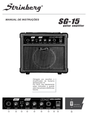 SG-15 MANUAL DE INSTRUÇÕES guitar amplifier Obrigado por escolher o Amplificador de Guitarra Strinberg SG-15. Por favor, leia atentamente estas instruções e guarde este manual para referências futuras. 115V POWER SWITCH 1 115V : 110V ~ 120V 60Hz 230V : 220V ~ 240V 50Hz 1 2 3 4 5 6 7 8 9 SSGG--1155 NOMES E FUNÇÕES PARA CADA PARTE OU CONTROLE 1. Jack INPUT É o terminal de entrada para jacks padrão de 1/4". Conecte a guitarra com um cabo blindado. 2. Controle OVERDRIVE - GAIN É possível ajustar o nível de saída do amplificador quando se usa o canal de distorção. Reduza o volume ao elevar o GAIN e HQ para aumentar o som. 3. DISTORTION ON/OFF Chave para o nível de entrada do canal de distorção. 4. Controle VOLUME Faz o controle do volume geral do amplificador. Tenha em mente que ao fazê-lo, seus ajustes em DISTORTION também afetarão o volume de certa maneira. 5. Controle TREBLE É um equalizador do tipo shelving para as freqüências altas. Através deste controle, você poderá aumentá-las ou diminuí-las. Ao girá-lo no sentido horário, haverá um acréscimo nas freqüências altas, fazendo com que sua guitarra soe mais aguda. 6. Controle BASS É um equalizador para as freqüências baixas. Através deste controle, você poderá aumentá-las ou diminuí-las. Ao girá-lo no sentido horário, haverá um acréscimo nas freqüências baixas, e, conforme o ajuste, o som será mais quente e pesado, se em combinação com a distorção. Ao girá-lo no sentido anti-horário, haverá uma redução das freqüências baixas no tom, fazendo com que sua guitarra soe menos grave. 7. Jack PHONES É um jack de saída padrão de 1/4" para fones de ouvido. O alto-falante deixa de receber sinal assim que os fones são conectados. Esta saída tem uma grande capacidade de volume. Certifique-se que o controle VOLUME esteja reduzido antes de começar a tocar com fones, e então, vá aumentando pouco a pouco o volume até o desejado. Por favor note que os ruídos e sons distorcidos produzidos ao se inserir ou remover o conector, com níveis altos de volume, poderão não apenas danificar os fones, como também a sua própria audição. 8. LED POWER Este LED se acenderá quando a chave POWER for ligada. 9. Chave POWER Esta chave liga e desliga a energia AC. Certifique-se que esta chave esteja na posição OFF quando não for mais utilizar o amplificador. 10. Chave Seletora de Voltagem Antes de ligar o amplificador, selecione a voltagem correta de acordo com a sua região. ESPECIFICAÇÕES • Controles: GAIN, VOLUME, TREBLE, BASS • Jacks: INPUT, PHONES • Chaves: OVERDRIVE, chave POWER ON/OFF • Potência de saída: 12 W (@ 1kHz / 8 Ohms) • Consumo: 18 W • Alto-falante: 5" @ 8 Ohms • Dimensões (L x H x P): 255 x 245 x 125 (mm) / 10 x 9,65 x 4,92 (polegadas) • Peso: 3,14 kg / 6 lb 15 oz NOTA: As informações contidas estão sujeitas a modificações sem prévio aviso.