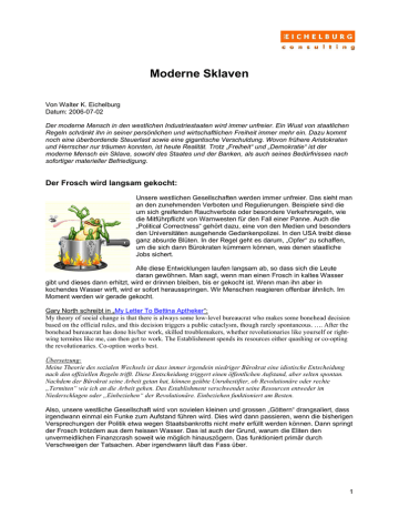 Moderne Sklaven Von Walter K. Eichelburg Datum: 2006-07-02 Der moderne Mensch in den westlichen Industriestaaten wird immer unfreier. Ein Wust von staatlichen Regeln schränkt ihn in seiner persönlichen und wirtschaftlichen Freiheit immer mehr ein. Dazu kommt noch eine überbordende Steuerlast sowie eine gigantische Verschuldung. Wovon frühere Aristokraten und Herrscher nur träumen konnten, ist heute Realität. Trotz „Freiheit“ und „Demokratie“ ist der moderne Mensch ein Sklave, sowohl des Staates und der Banken, als auch seines Bedürfnisses nach sofortiger materieller Befriedigung. Der Frosch wird langsam gekocht: Unsere westlichen Gesellschaften werden immer unfreier. Das sieht man an den zunehmenden Verboten und Regulierungen. Beispiele sind die um sich greifenden Rauchverbote oder besondere Verkehrsregeln, wie die Mitführpflicht von Warnwesten für den Fall einer Panne. Auch die „Political Correctness“ gehört dazu, eine von den Medien und besonders den Universitäten ausgehende Gedankenpolizei. In den USA treibt diese ganz absurde Blüten. In der Regel geht es darum, „Opfer“ zu schaffen, um die sich dann Bürokraten kümmern können, was denen staatliche Jobs sichert. Alle diese Entwicklungen laufen langsam ab, so dass sich die Leute daran gewöhnen. Man sagt, wenn man einen Frosch in kaltes Wasser gibt und dieses dann erhitzt, wird er drinnen bleiben, bis er gekocht ist. Wenn man ihn aber in kochendes Wasser wirft, wird er sofort herausspringen. Wir Menschen reagieren offenbar ähnlich. Im Moment werden wir gerade gekocht. Gary North schreibt in „My Letter To Bettina Aptheker“: My theory of social change is that there is always some low-level bureaucrat who makes some bonehead decision based on the official rules, and this decision triggers a public cataclysm, though rarely spontaneous. …. After the bonehead bureaucrat has done his/her work, skilled troublemakers, whether revolutionaries like yourself or rightwing termites like me, can then get to work. The Establishment spends its resources either quashing or co-opting the revolutionaries. Co-option works best. Übersetzung: Meine Theorie des sozialen Wechsels ist dass immer irgendein niedriger Bürokrat eine idiotische Entscheidung nach den offiziellen Regeln trifft. Diese Entscheidung triggert einen öffentlichen Aufstand, aber selten spontan. Nachdem der Bürokrat seine Arbeit getan hat, können geübte Unruhestifter, ob Revolutionäre oder rechte „Termiten“ wie ich an die Arbeit gehen. Das Establishment verschwendet seine Resourcen entweder im Niederschlagen oder „Einbeziehen“ der Revolutionäre. Einbeziehen funktioniert am Besten. Also, unsere westliche Gesellschaft wird von sovielen kleinen und grossen „Göttern“ drangsaliert, dass irgendwann einmal ein Funke zum Aufstand führen wird. Dies wird dann passieren, wenn die bisherigen Versprechungen der Politik etwa wegen Staatsbankrotts nicht mehr erfüllt werden können. Dann springt der Frosch trotzdem aus dem heissen Wasser. Das ist auch der Grund, warum die Eliten den unvermeidlichen Finanzcrash soweit wie möglich hinauszögern. Das funktioniert primär durch Verschweigen der Tatsachen. Aber irgendwann läuft das Fass über. 1 Steuersklave: Leute, die sich in Geschichte auskennen, werden wissen, dass in früheren Jahrhunderten der Leibeigenschaft oder der Kleinpächter etwa 10% an den Grundherrn abgeliefert werden musste. Das konnte in Arbeitsleistung, landwirtschaftlichen Produkten oder Geld (selten) geschehen. Daher auch das Wort „Zehent“ für diese Abgabe. Die Leibeigenschaft wurde dann aufgehoben, um das ganze System effizienter zu machen, denn wer eigenes oder gepachtetes Land bewirtschaftet, produziert mehr und braucht keine Aufsicht, die auch kostet. Im Gegensatz dazu saugt der moderne Staat in Form von Steuern und Sozialabgaben zwischen 40 und 60% der Arbeitsleistung ab. Davon wird nicht nur das Heer von Bürokraten finanziert, sondern noch wichtiger, die „Sozialausgaben“ zum Stimmenkauf. Sobald die Wähler entdecken, dass sie Geld in ihre Taschen „wählen“ können, wird eine Demokratie kollabieren, und zwar mit dem Endresultat Hyperinflation. Dazu ein guter Artikel von Ron Paul. Es ist interessant, dass besonders eine Gruppe von „Staatsbürgern“ die grösste Last trägt. Die gut verdienenden und gut ausgebildeten Angestellten. Diese Gruppe hat die geringsten SteuerabsetzMöglichkeiten und kann niemals mit Vorsteuer-Einkommen investieren, wie es Unternehmer können. Daneben gibt es noch zwei „privegierte“ Gruppen, die wenig oder gar keine Steuern bezahlen: a) die Unterschichten: Diese bezahlen kaum Einkommensteuer, aber Sozialabgaben und Konsumsteuern. Ein grosser Teil, der überhaupt nicht arbeitet, wird komplett vom Staat, d.h. der oberen Gruppe finanziert. Der Grund dafür liegt einmal im grossen Wählerpotential, dass man halten möchte, und natürlich geht es um den Erhalt und Ausbau der Sozialbürokratie b) die Grossfirmen und manche Kapitalbesitzer: Besonders in Deutschland ist es heute bereits üblich, dass multinationale Grossfirmen kaum mehr Körperschaftssteuer bezahlen. Das geschieht einerseits über Lobbying für Steuerausnahmen, oder über Versteuerung in anderen, günstigeren Ländern. Schlägt beim kleinen Kapitalbesitzer die Steuer unbarmherzig zu, so kann man ab einer gewissen Kapitalhöhe Konstruktionen in Steueroasen finden, wo kaum Steuer bezahlt wird. Beispiel Österreich: Das ist das Land der Stiftungen, wo nur beim Einbringen und Herausholen (25% Steuersatz) Steuer bezahlt werden muss. Etwa Friedrich Flick lebt hier mit einer solchen Konstruktion. Auch ist die Körperschaftssteuer auf GmbHs und AGs nur 25%, Gewerbesteuer und Vermögenssteuer gibt es keine. Die benachbarte Slowakei hat überhaupt nur 19% Körperschaftssteuer. Angestellte dagegen bezahlen schon ab ca € 65000 Jahreseinkommen den vollen Einkommenssteuer-Satz von 50%. Kein Wunder, dass viele deutsche Firmen nach Österr