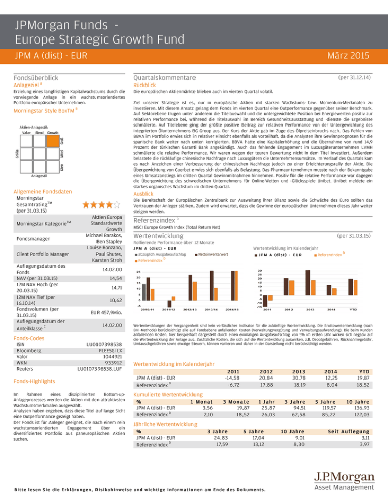 JPMorgan Funds Europe Strategic Growth Fund JPM A (dist) - EUR März 2015 Fondsüberblick Quartalskommentare Anlageziel A Rückblick Erzielung eines langfristigen Kapitalwachstums durch die vorwiegende Anlage in ein wachstumsorientiertes Portfolio europäischer Unternehmen. Die europäischen Aktienmärkte blieben auch im vierten Quartal volatil. Morningstar Style BoxTM B Allgemeine Fondsdaten Fondsmanager Client Portfolio Manager Auflegungsdatum des Fonds NAV (per 31.03.15) 12M NAV Hoch (per 20.03.15) 12M NAV Tief (per 16.10.14) Fondsvolumen (per 31.03.15) Auflegungsdatum der C Anteilklasse Die Bereitschaft der Europäischen Zentralbank zur Ausweitung ihrer Bilanz sowie die Schwäche des Euro sollten das Vertrauen der Anleger stärken. Zudem wird erwartet, dass die Gewinne der europäischen Unternehmen dieses Jahr weiter steigen werden. Aktien Europa Standardwerte Growth Michael Barakos, Ben Stapley Louise Bonzano, Paul Shutes, Karsten Stroh Referenzindex D MSCI Europe Growth Index (Total Return Net) Wertentwicklung (per 31.03.15) Rollierende Performance über 12 Monate JPM A (dist) EUR ■ abzüglich Ausgabeaufschlag ■ Referenzindex Wertentwicklung im Kalenderjahr ■ Nettoinwentarwert ■ D JPM A (dist) EUR ■ Referenzindex D 14.02.00 14,54 14,71 10,62 EUR 457,9Mio. 14.02.00 Fonds FondsCodes ISIN Bloomberg Valor WKN Reuters Ziel unserer Strategie ist es, nur in europäische Aktien mit starken Wachstums Wachstums bzw. Momentum MomentumMerkmalen zu investieren. Mit diesem Ansatz gelang dem Fonds im vierten Quartal eine Outperformance gegenüber seiner Benchmark. Auf Sektorebene trugen unter anderem die Titelauswahl und die untergewichtete Position bei Energiewerten positiv zur relativen Performance bei, während die Titelauswahl im Bereich Gesundheitsausstattung und dienste die Ergebnisse schmälerte. Auf Titelebene ging der größte positive Beitrag zur relativen Performance von der Untergewichtung des integrierten Ölunternehmens BG Group aus. Der Kurs der Aktie gab im Zuge des Ölpreiseinbruchs nach. Das Fehlen von BBVA im Portfolio erwies sich in relativer Hinsicht ebenfalls als vorteilhaft, da die Analysten ihre Gewinnprognosen für die spanische Bank weiter nach unten korrigierten. BBVA hatte eine Kapitalerhöhung und die Übernahme von rund 14,9 Prozent der türkischen Garanti Bank angekündigt. Auch das fehlende Engagement im Luxusgüterunternehmen LVMH schmälerte die relative Performance. Wir waren wegen der teuren Bewertung nicht in dem Titel investiert. Außerdem belastete die rückläufige chinesische Nachfrage nach Luxusgütern die Unternehmensumsätze. Im Verlauf des Quartals kam es nach Anzeichen einer Verbesserung der chinesischen Nachfrage jedoch zu einer Erleichterungsrally der Aktie. Die Übergewichtung von Guerbet erwies sich ebenfalls als Belastung. Das Pharmaunternehmen musste nach der Bekanntgabe eines Umsatzanstiegs im dritten Quartal Gewinnmitnahmen hinnehmen. Positiv für die relative Performance war dagegen die Übergewichtung des schwedischen Unternehmens für Online OnlineWetten und Glücksspiele Unibet. Unibet meldete ein starkes organisches Wachstum im dritten Quartal. Ausblick Morningstar Gesamtrating TM (per 31.03.15) Morningstar KategorieTM (per 31.12.14) LU0107398538 FLEESGI LX 1044921 933912 LU0107398538.LUF Fonds FondsHighlights Im Rahmen eines disziplinierten Bottom Bottomup up Anlageprozesses werden die Aktien mit den attraktivsten Wachstumsmerkmalen ausgewählt. Analysen haben ergeben, dass diese Titel auf lange Sicht eine Outperformance gezeigt haben. Der Fonds ist für Anleger geeignet, die nach einem rein wachstumsorientierten Engagement über ein diversifiziertes Portfolio aus paneuropäischen Aktien suchen. Wertentwicklungen der Vergangenheit sind kein verlässlicher Indikator für die zukünftige Wertentwicklung. Die Bruttowertentwicklung (nach BVI BVIMethode) berücksichtigt alle auf Fondsebene anfallenden Kosten (Verwaltungsvergütung und Verwaltungsaufwendung). Die beim Kunden anfallenden Kosten, hier beispielhaft dargestellt durch einen einmaligen Ausgabeaufschlag von 5% im ersten Jahr wirken sich negativ auf die Wertentwicklung der Anlage aus. Zusätzliche Kosten, die sich auf die Wertentwicklung auswirken, z.B. Depotgebühren, Rücknahmegebühr, Umtauschgebühren sowie etwaige Steuern, können variieren und daher in der Darstellung nicht berücksichtigt werden. Wertentwicklung im Kalenderjahr 2011 14,58 6,72 JPM A (dist) EUR D Referenzindex 2012 20,84 17,88 2013 30,78 18,19 2014 12,25 8,04 YTD 19,87 18,52 3 Jahre 94,51 62,58 5 Jahre 119,57 85,22 10 Jahre 136,93 122,03 Kumulierte Wertentwicklung % JPM A (dist) EUR Referenzindex D 1 Monat 3,56 2,10 3 Monate 19,87 18,52 1 Jahr 25,87 26,03 Jährliche Wertentwicklung % JPM A (dist) EUR D Referenzindex 3 Jahre 24,83 17,59 5 Jahre 17,04 13,12 Bitte lesen Sie die Erklärungen, Risikohinweise und wichtige Informationen am Ende des Dokuments. 10 Jahre 9,01 8,30 Seit Auflegung 3,11 3,97 JPMorgan Funds - Europe Strategic Growth Fund Fondskennzahlen Eignung für den Anleger Fondsgebühren Anlegerprofil Ausgabeaufschlag (max.) Rücknahmegebühr (max.) Jährl. Verwaltungsgeb. Vertriebsgebühr Aufwendungen TER (Gesamtkostenquote) Fondskennzahlen Korrelation Alpha Beta Volatilität p.a. Sharpe Ratio Tracking Error Information Ratio 3 Jahre 0,92 6,16 0,94 10,18 2,24 4,11 1,48 Positionen Top 10 10Positionen Aktienbestand Novartis (Gesundheitswesen) Nestle (Nicht (Nichtzykl. Konsumwerte) Unilever (Nicht (Nichtzykl. Konsumwerte) Novo Nordisk (Gesundheitswesen) Bayer (Gesundheitswesen) British American Tobacco (Nicht (Nichtzykl. Konsumwerte) Prudential (Finanztitel) Reckitt Benckiser (Nicht (Nichtzykl. Konsumwerte) L Oreal (Nicht (Nichtzykl. Konsumwerte) LVMH (Zykl. Konsumgüter) 5,00% 0,50% 1,50% 0,00% 0,40% 1,90% Dies ist ein wachstumsorientierter Aktienteilfonds, der konzipiert ist, um Engagements in europäischen Wachstumsunternehmen zu ermöglichen. Da Wachstumswerte die Tendenz zeigen, Substanzwert