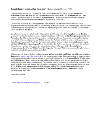 Kurzinterpretation „Der Panther“ (Rainer Maria Rilke, ca. 1909) Es handelt sich hier um ein Gedicht von Rainer Maria Rilke (1875 – 1926), der als wichtigster deutschsprachiger Dichter des 20. Jahrhunderts und Hauptvertreter des Symbolismus gilt. "Der Panther" gehört zu seinen so genannten "Dinggedichten", welche durch penible Beobachtung des Äusseren versuchen dem Inneren des Objekts Ausdruck zu verleihen. Das Gedicht beschreibt die Gefangenschaft eines Panthers im Pariser Jardin des Plantes, der in majestätischer Manier einer Raubkatze geschmeidig im Kreise wandert. Die letzte Strophe setzt sich dann vertiefter mit dem traurigen Dasein, welches der Panther eingesperrt fristet, auseinander und betont die Leere im Herzen des Tiers. Sprache und Form sind einfach und wohl geordnet. Das Gedicht ist in drei Strophen von je 4 Zeilen unterteilt, welche allesamt einen reinen Kreuzreim bilden. Metrum ist ein fünfhebiger Jambus bis auf Ausnahme des letzten Verses. Der dort leicht verkürzte vierfüssige Jambus hat einen direkten Bezug zum Inhalt. Wie das aufgenommene Bild im Herzen des Panthers aufhört zu sein, so hört auch das Gedicht noch "unvollendet" auf. Der Zeilenstil wird in Zeile 9 unterbrochen durch ein Enjambement, mit dem Effekt eines Spannungsaufbaus der sich über das Zeilenende hinweg zieht, von den nächsten Präpositionen verstärkt wird und in der letzten Zeile seinen Höhepunkt findet. Die dreifache Wiederholung des Wortes "Stäbe" und die Hyperbel ("tausend" Stäbe) in der ersten Strophe betonen zusätzlich seine hoffnungslose Gefangenschaft. Rilke errang mit diesem Gedicht zu Recht grosse Aufmerksamkeit und Erfolg noch bis zum heutigen Tage (siehe: http://www.rilke-projekt.de/). Die objektive und exakte Tierbeschreibung in wunderschöner Anwendung der deutschen Sprache war dabei wohl gleichbedeutend, wie die empathische Wiedergabe des Gefühlslebens dieser majestätischen Raubkatze. Der Dichter stellt hier die anmutende, im Gehege stolzierende Fassade dieses eingesperrten Tiers, der im Inneren gefangenen, wilden Seele gegenüber, die durch keinerlei Reize von Aussen mehr erreicht werden kann. Somit übt Rilke auf seine eigene Art und Weise Kritik an der unartgerechten Haltung von wilden Tieren in Gefangenschaft und auch allgemein an Situationen, in denen der eigene Wille betäubt durch äussere Enflüsse an seiner Entfaltung gehindert wird. Autor: Lee Muritu Quelle: http://lyrikonline.hep-verlag.ch (27.5. 2014)