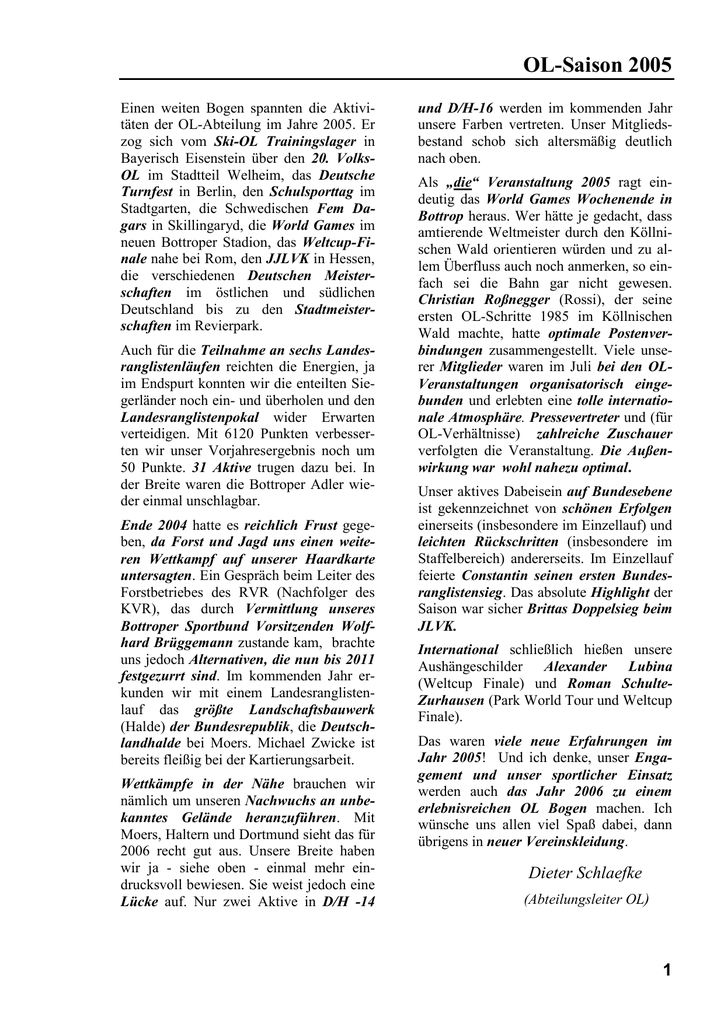 OL-Saison 2005 Einen weiten Bogen spannten die Aktivitäten der OL-Abteilung im Jahre 2005. Er zog sich vom Ski-OL Trainingslager in Bayerisch Eisenstein über den 20. VolksOL im Stadtteil Welheim, das Deutsche Turnfest in Berlin, den Schulsporttag im Stadtgarten, die Schwedischen Fem Dagars in Skillingaryd, die World Games im neuen Bottroper Stadion, das Weltcup-Finale nahe bei Rom, den JJLVK in Hessen, die verschiedenen Deutschen Meisterschaften im östlichen und südlichen Deutschland bis zu den Stadtmeisterschaften im Revierpark. Auch für die Teilnahme an sechs Landesranglistenläufen reichten die Energien, ja im Endspurt konnten wir die enteilten Siegerländer noch ein- und überholen und den Landesranglistenpokal wider Erwarten verteidigen. Mit 6120 Punkten verbesserten wir unser Vorjahresergebnis noch um 50 Punkte. 31 Aktive trugen dazu bei. In der Breite waren die Bottroper Adler wieder einmal unschlagbar. Ende 2004 hatte es reichlich Frust gegeben, da Forst und Jagd uns einen weiteren Wettkampf auf unserer Haardkarte untersagten. Ein Gespräch beim Leiter des Forstbetriebes des RVR (Nachfolger des KVR), das durch Vermittlung unseres Bottroper Sportbund Vorsitzenden Wolfhard Brüggemann zustande kam, brachte uns jedoch Alternativen, die nun bis 2011 festgezurrt sind. Im kommenden Jahr erkunden wir mit einem Landesranglistenlauf das größte Landschaftsbauwerk (Halde) der Bundesrepublik, die Deutschlandhalde bei Moers. Michael Zwicke ist bereits fleißig bei der Kartierungsarbeit. Wettkämpfe in der Nähe brauchen wir nämlich um unseren Nachwuchs an unbekanntes Gelände heranzuführen. Mit Moers, Haltern und Dortmund sieht das für 2006 recht gut aus. Unsere Breite haben wir ja - siehe oben - einmal mehr eindrucksvoll bewiesen. Sie weist jedoch eine Lücke auf. Nur zwei Aktive in D/H -14 und D/H-16 werden im kommenden Jahr unsere Farben vertreten. Unser Mitgliedsbestand schob sich altersmäßig deutlich nach oben. Als „die“ Veranstaltung 2005 ragt eindeutig das World Games Wochenende in Bottrop heraus. Wer hätte je gedacht, dass amtierende Weltmeister durch den Köllnischen Wald orientieren würden und zu allem Überfluss auch noch anmerken, so einfach sei die Bahn gar nicht gewesen. Christian Roßnegger (Rossi), der seine ersten OL-Schritte 1985 im Köllnischen Wald machte, hatte optimale Postenverbindungen zusammengestellt. Viele unserer Mitglieder waren im Juli bei den OLVeranstaltungen organisatorisch eingebunden und erlebten eine tolle internationale Atmosphäre. Pressevertreter und (für OL-Verhältnisse) zahlreiche Zuschauer verfolgten die Veranstaltung. Die Außenwirkung war wohl nahezu optimal. Unser aktives Dabeisein auf Bundesebene ist gekennzeichnet von schönen Erfolgen einerseits (insbesondere im Einzellauf) und leichten Rückschritten (insbesondere im Staffelbereich) andererseits. Im Einzellauf feierte Constantin seinen ersten Bundesranglistensieg. Das absolute Highlight der Saison war sicher Brittas Doppelsieg beim JLVK. International schließlich hießen unsere Aushängeschilder Alexander Lubina (Weltcup Finale) und Roman SchulteZurhausen (Park World Tour und Weltcup Finale). Das waren viele neue Erfahrungen im Jahr 2005! Und ich denke, unser Engagement und unser sportlicher Einsatz werden auch das Jahr 2006 zu einem erlebnisreichen OL Bogen machen. Ich wünsche uns allen viel Spaß dabei, dann übrigens in neuer Vereinskleidung. Dieter Schlaefke (Abteilungsleiter OL) 1