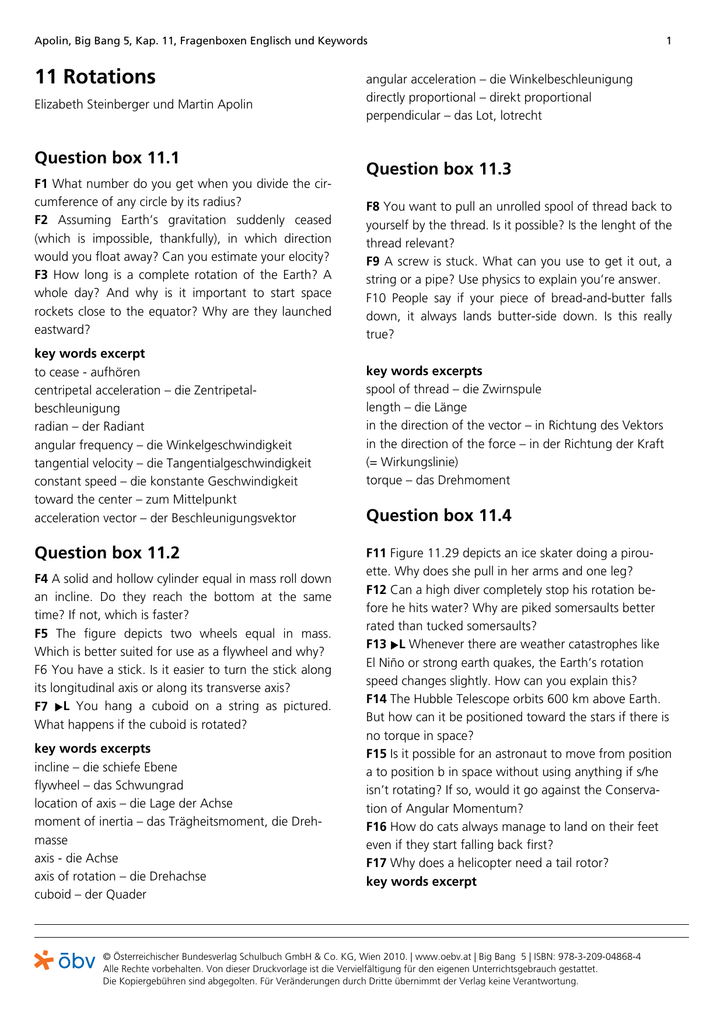 Apolin, Big Bang 5, Kap. 11, Fragenboxen Englisch und Keywords 11 Rotations Elizabeth Steinberger und Martin Apolin Question box 11.1 F1 What number do you get when you divide the circumference of any circle by its radius? F2 Assuming Earth’s gravitation suddenly ceased (which is impossible, thankfully), in which direction would you float away? Can you estimate your elocity? F3 How long is a complete rotation of the Earth? A whole day? And why is it important to start space rockets close to the equator? Why are they launched eastward? key words excerpt to cease - aufhören centripetal acceleration – die Zentripetalbeschleunigung radian – der Radiant angular frequency – die Winkelgeschwindigkeit tangential velocity – die Tangentialgeschwindigkeit constant speed – die konstante Geschwindigkeit toward the center – zum Mittelpunkt acceleration vector – der Beschleunigungsvektor Question box 11.2 F4 A solid and hollow cylinder equal in mass roll down an incline. Do they reach the bottom at the same time? If not, which is faster? F5 The figure depicts two wheels equal in mass. Which is better suited for use as a flywheel and why? F6 You have a stick. Is it easier to turn the stick along its longitudinal axis or along its transverse axis? F7 XL You hang a cuboid on a string as pictured. What happens if the cuboid is rotated? key words excerpts incline – die schiefe Ebene flywheel – das Schwungrad location of axis – die Lage der Achse moment of inertia – das Trägheitsmoment, die Drehmasse axis - die Achse axis of rotation – die Drehachse cuboid – der Quader 1 angular acceleration – die Winkelbeschleunigung directly proportional – direkt proportional perpendicular – das Lot, lotrecht Question box 11.3 F8 You want to pull an unrolled spool of thread back to yourself by the thread. Is it possible? Is the lenght of the thread relevant? F9 A screw is stuck. What can you use to get it out, a string or a pipe? Use physics to explain you’re answer. F10 People say if your piece of bread-and-butter falls down, it always lands butter-side down. Is this really true? key words excerpts spool of thread – die Zwirnspule length – die Länge in the direction of the vector – in Richtung des Vektors in the direction of the force – in der Richtung der Kraft (= Wirkungslinie) torque – das Drehmoment Question box 11.4 F11 Figure 11.29 depicts an ice skater doing a pirouette. Why does she pull in her arms and one leg? F12 Can a high diver completely stop his rotation before he hits water? Why are piked somersaults better rated than tucked somersaults? F13 XL Whenever there are weather catastrophes like El Niño or strong earth quakes, the Earth’s rotation speed changes slightly. How can you explain this? F14 The Hubble Telescope orbits 600 km above Earth. But how can it be positioned toward the stars if there is no torque in space? F15 Is it possible for an astronaut to move from position a to position b in space without using anything if s/he isn’t rotating? If so, would it go against the Conservation of Angular Momentum? F16 How do cats always manage to land on their feet even if they start falling back first? F17 Why does a helicopter need a tail rotor? key words excerpt © Österreichischer Bundesverlag Schulbuch GmbH & Co. KG, Wien 2010. | www.oebv.at | Big Bang 5 | ISBN: 978-3-209-04868-4 Alle Rechte vorbehalten. Von dieser Druckvorlage ist die Vervielfältigung für den eigenen Unterrichtsgebrauch gestattet. Die Kopiergebühren sind abgegolten. Für Veränderungen durch Dritte übernimmt der Verlag keine Verantwortung. Apolin, Big Bang 5, Kap. 11, Fragenboxen Englisch und Keywords angular momentum – der Drehimpuls rotating mass – rotierende Masse torque – das Drehmoment Conservation of Angular Momentum Principle – Erhaltung des Drehimpulses earth quake – das Erdbeben Question box 11.5 F18 A hollow cylinder rolls more slowly down an incline than a solid one does if they are equal in mass (fig. 11.9, chapter. 11.2). Can you explain this phenomenon using Conservation of Energy? F19 Tidal friction causes Earth’s rotation to slow down. Its friction slows Earth by a mere 50 nanoseconds each day. How does this fit with the Conservation of Angular Momentum? key words excerpt hollow cylinder – der Hohlzylinder phenomenon – das Phänomen Conservation of Energy – die Energieerhaltung rotational energy – die Rotationsenergie closed system – das abgeschlossene System homogeneous - homogen angular velocity – die Winkelgeschwindigkeit tides – die Gezeiten tidal friction – die Gezeitenreibung Earth’s rotation – die Erdrotation 2 rotation speed increases, and often times the floor will drop out and everyone will stay pressed up against the wall off the ground. Which force do you see if you are watching your friend from outside the cylinder? F23 They say that astronauts are weightless when they orbit Earth in space. Does that mean there is not any gravity where they are? Can they use rotation to produce artificial gravitation. F24 What kind of curve would you observe if you were standing on a rotating platform when the ball was thrown? What would the person standing next to the platform see? key words excerpt Inertial frame of reference – das Inertialsystem centripetal force – die Zentripetalkraft centrifugal force- die Zentrifugalkraft static friction – die statische Reibung velocity – die Geschwindigkeit vector – der Vektor observer – der Beobachter to observe - beobachten loop the loop – der Looping inside/within - innen outside - außen gravity – die Gravitation perpendicular to – senkrecht auf parallel to – parallel zu rotating - rotierend pseudo force – die Scheinkraft weightlessness – die Schwerelosigkeit coriolis effect – die Cirioliskraft Question box 11.6 F19 What is an Inertial frame of reference and what does Newton's first law of motion (aka Law of Inertia) say? Reread chapter 6.1 and 8.2 . F20 Why do racers 