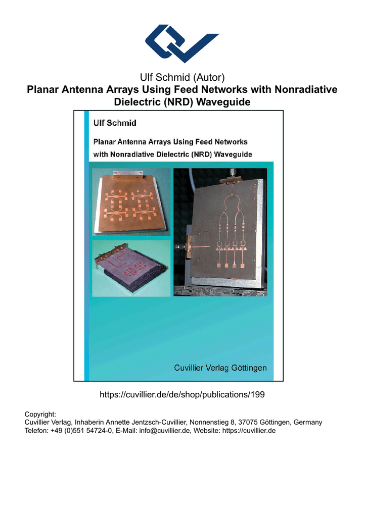 Ulf Schmid (Autor) Planar Antenna Arrays Using Feed Networks with Nonradiative Dielectric (NRD) Waveguide https://cuvillier.de/de/shop/publications/199 Copyright: Cuvillier Verlag, Inhaberin Annette Jentzsch-Cuvillier, Nonnenstieg 8, 37075 Göttingen, Germany Telefon: +49 (0)551 54724-0, E-Mail: [email protected], Website: https://cuvillier.de 1 Introduction For advanced communication and sensor applications, antennas with low profile, low loss, and low production cost are required. While planar antennas are very well-suited with respect to antenna depth and cost, they suffer from high losses due to the feeding network, especially for narrow beamwidths [1, 2]. In the case of a microstrip array with corporate microstrip feeding network, the losses increase strongly with the overall size of the antenna array, Fig. 1.1 and [3]. If an element spacing of half a free space wavelength and a microstrip transmission line loss of 0.15 dB per guide wavelength are assumed, maximum gain is in the range of 30 dBi to 35 dBi. With increasing antenna size beamwidth still decreases, but gain decreases, too. With a series feeding the feed network loss can be reduced, but only at the cost of bandwidth. Another issue with series feeding is the specific beam tilt over frequency, which is problematic especially dB 60 Directivity Gain Feed network losses 50 40 30 20 10 0 0 10 20 30 40 50 60 70 Linear antenna dimensions in multiples of free space wavelength Fig. 1.1: Feed network losses, directivity and gain of a microstrip array with corporate microstrip feed network. 1 Dieses Werk ist copyrightgeschützt und darf in keiner Form vervielfältigt werden noch an Dritte weitergegeben werden. Es gilt nur für den persönlichen Gebrauch. 1 Introduction for high gain pencil beam antennas with extremely narrow beamwidths. Arrays of horn antennas with a waveguide feed network [4] or waveguide slotted arrays [5–7] which are typically based on a series feeding, are lower in loss, but partly narrow band and usually complicated in design, and they do not readily lend themselves to low cost fabrication. In a former project some work was reported on the fabrication of waveguide networks and antennas [8] as well as waveguide filters and diplexers [9] using plastic injection molding and electroplating, but the authors reported significant reduction of gain compared to the results achieved with a prototype machined from solid aluminum [4]. Printed reflectarrays are known to be an alternative solution leading to high gain and low loss antennas [10], but for some communication applications, the antenna depth even with a folding approach [11] is still too big. Another approach combines microstrip antenna arrays with a waveguide feed network [12–15] for the reduction of feed network losses. Again, the waveguide network may be fabricated using plastic injection molding and electroplating to reduce fabrication cost. Nevertheless, waveguide is still quite bulky and provides some difficulties in designing and assembling the feed network for a restricted space behind the antenna. In this work an alternative waveguide, the nonradiative dielectric (NRD) waveguide, has been investigated for feeding planar mm-wave antennas. This approach combines the low loss behavior of the NRD-guide feeding network with low profile and low production cost of planar antennas (e.g. microstrip arrays). εr LSM01 mode hNRD LSE01 mode E H direction of propagation Fig. 1.2: Fundamental modes on the NRD-guide. 2 Dieses Werk ist copyrightgeschützt und darf in keiner Form vervielfältigt werden noch an Dritte weitergegeben werden. Es gilt nur für den persönlichen Gebrauch. The NRD-guide, according to Fig. 1.2, consists of a dielectric strip sandwiched between two metal plates with a spacing hNRD smaller than a half of free space wavelength. Assuming the same potential for both metal plates, i.e. a symmetry of the electromagnetic fields with a magnetic wall in the plane at half the NRDguide height, assures that all modes are guided by the dielectric strip. As a result, radiation can only be caused by asymmetries along the NRD-guide height generating the parallel plate mode which is not guided by the dielectric strip. Thus it is feasible to design a group of non-radiative building blocks including bends, curves, and T-junctions, required for complex parallel or series feeding networks. The wave is guided by the dielectric strip in the form of longitudinal section electric (LSE) and longitudinal section magnetic (LSM) waves. In practical applications, especially in the microwave and mm-wave range, more complicated feeding structures based on the ideal NRD-guide are difficult to implement due to alignment problems. In order to circumvent these problems, different forms of implementations indicated in Fig. 1.3 have been presented in the past. εr εr2 εr1 εr2 Ideal NRD-guide Channelized NRD-guide (εr2 < εr1 ) εr εr εr Groove NRD-guide Synthesized NRD-guide Engraved NRD(ENRD)-guide Substrate integrated (SI)NRD-guide Fig. 1.3: Nonradiative dielectric waveguide (NRD-guide) and several alternative setups. The channelized NRD-guide [16] consists of two materials with different values of εr , where the material with the lower relative dielectric constant εr2 serves for alignment and might be a type of foam with electrical properties similar to air. 3 Dieses Werk ist copyrightgeschützt und darf in keiner Form vervielfältigt werden noch an Dritte weitergegeben werden. Es gilt nur für den persönlichen Gebrauch. 1 Introduction The groove NRD-guide [17–19] features a groove milled into the metal ground planes which makes alignment of the guiding strip easier and more precise. In the synthesized NRD-guide, or substrate integrated NRD (SINRD) waveguide [20–22], the transmission line is defined by a set of holes along the wave guiding area, implementing the low dielectric region as compared to the channelized NRD-guide. The engraved NRD(ENRD)-guide [23] is mil