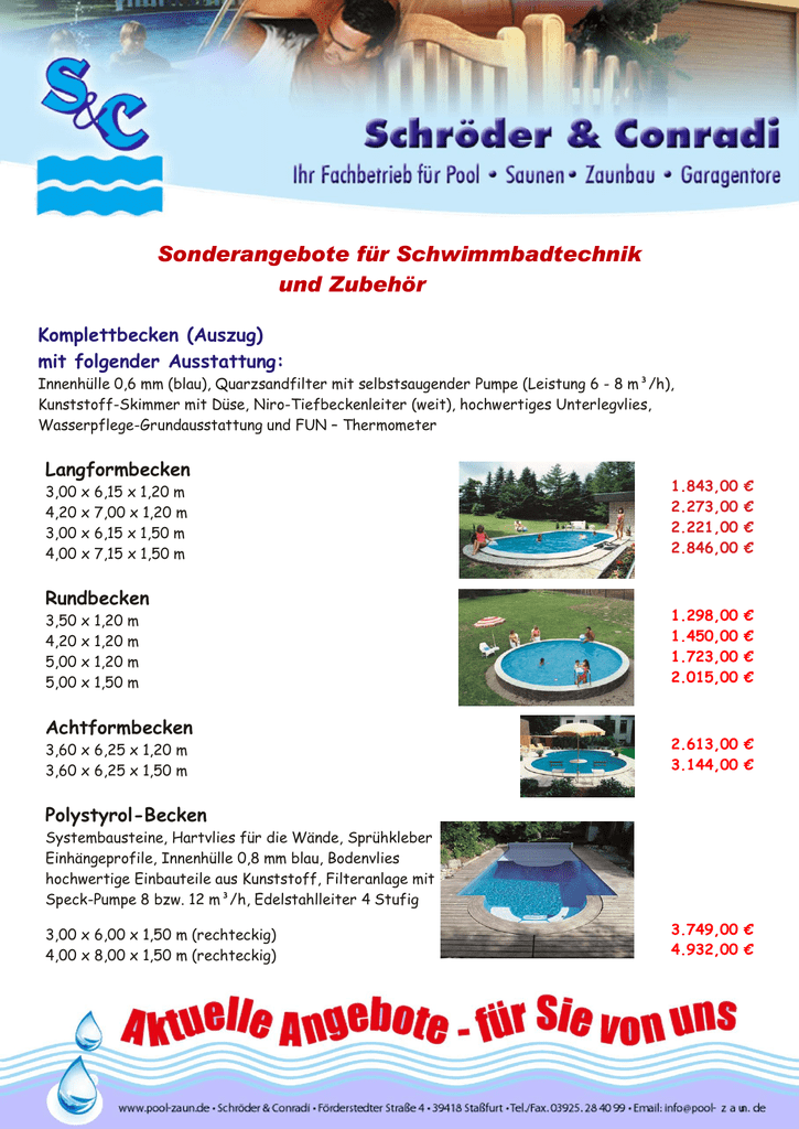 Sonderangebote für Schwimmbadtechnik und Zubehör Komplettbecken (Auszug) mit folgender Ausstattung: Innenhülle 0,6 mm (blau), Quarzsandfilter mit selbstsaugender Pumpe (Leistung 6 - 8 m³/h), Kunststoff-Skimmer mit Düse, Niro-Tiefbeckenleiter (weit), hochwertiges Unterlegvlies, Wasserpflege-Grundausstattung und FUN – Thermometer Langformbecken 3,00 x 4,20 x 3,00 x 4,00 x 6,15 x 1,20 m 7,00 x 1,20 m 6,15 x 1,50 m 7,15 x 1,50 m Rundbecken 3,50 x 4,20 x 5,00 x 5,00 x 1,20 m 1,20 m 1,20 m 1,50 m Achtformbecken 3,60 x 6,25 x 1,20 m 3,60 x 6,25 x 1,50 m 1.843,00 2.273,00 2.221,00 2.846,00 € € € € 1.298,00 1.450,00 1.723,00 2.015,00 € € € € 2.613,00 € 3.144,00 € Polystyrol-Becken Systembausteine, Hartvlies für die Wände, Sprühkleber Einhängeprofile, Innenhülle 0,8 mm blau, Bodenvlies hochwertige Einbauteile aus Kunststoff, Filteranlage mit Speck-Pumpe 8 bzw. 12 m³/h, Edelstahlleiter 4 Stufig 3,00 x 6,00 x 1,50 m (rechteckig) 4,00 x 8,00 x 1,50 m (rechteckig) 3.749,00 € 4.932,00 € Edelstahlleiter Tiefbeckenleiter eng 3-stufig, hochwertiger Edelstahl, Holme 43mm Ø, Einbauhalterung und Rosetten 159,00 € Tiefbeckenleiter eng 4-stufig, hochwertiger Edelstahl, Holme 43mm Ø, Einbauhalterung und Rosetten 169,00 € Tiefbeckenleiter weit 3-stufig, hochwertiger Edelstahl, Holme 43mm Ø, Einbauhalterung und Rosetten 164,00 € Tiefbeckenleiter weit 4-stufig, hochwertiger Edelstahl, Holme 43mm Ø, Einbauhalterung und Rosetten 175,00 € Hochbeckenleiter 1,2 m, Edelstahl-Holme 43 mm Ø, mit beweglichen Kunststoff-Fußtellern, sowie Stufen + Plattform aus Kunststoff für Wandhöhe 1,2 m 255,00 € Hoch-Kurzbeckenleiter 1,2 x 0,4 m, Edelstahl-Holme 43 mm Ø, mit beweglichen Kunststoff-Fußtellern, sowie Stufen + Plattform aus Kunststoff (1 x 1 Stufe/1 x 4 Stufen) 235,00 € Filterannlagen SANDY 40 Quarzsandfilter mit Kunststoffkessel Ø 300 mm Mit Top-Mount-Ventil, selbstsaugender Pumpe, ca. 4 m3/h, 230 V und Manometer, Sandmenge ca. 25 kg SANDY 70 Quarzsandfilter mit Kunststoffkessel Ø 380 mm mit Top-Mount-Ventil, selbstsaugender Pumpe, ca. 7 m3/h, 230 V und Manometer, Sandmenge ca. 50 kg SANDY 90 Quarzsandfilter mit Kunststoffkessel Ø 430 mm mit Top-Mount-Ventil, selbstsaugender Pumpe, ca. 9 m3/h, 230 V und Manometer, Sandmenge ca. 60 kg Quarzsand 0,4 - 0,8 mm im 25kg Sack andere Korngrößen auf Anfrage 290,00 € 345,00 € 395,00 € 8,00 € Einbauteile und Zubehör Einlaufdüse für Folienbecken mit Dichtungen und Schrauben, sowie Kontermutter R2"außen 2", innen 50 mm Klebeanschluss, Multiflow-Kugel 14 mm, kann vergrößert werden. Sonder VK 23,00 € UW-Kunststoff-Scheinwerfer für Folienbecken 12 V 300 Watt, rund, komplett mit Kabelschutz-Schlauch und Folienflanschsatz mit Dichtungen und Niro-Schrauben 108,00 € Sicherheitstrafo 12 V 300 W 160,00 € Kunststoff - Skimmer für Fertigbecken, bis ca. 40 m³ Inhalt, mit Flanschteilinnen 15 x 14 cm, Vakuumscheibe und Einlaufdüse, Anschluss 1 1/2" 45,00 € Kunststoff - Skimmer Folie mit verstellbarem oberen Abschlussdeckel und Folienflansch innen 210 x 145 mm, Einbautiefe 245 mm, Anschluss 2" 140,00 € Kunststoff - Skimmer wie zuvor, Einbautiefe 365 mm 160,00 € Bodenablauf für Folienbecken, mit flachem Gitterrost 2" Innengewinde 45,00 € STANDARD Bodenreiniger 17,00 € LUXUS Bodenreiniger mit Seitenbürsten 24,00 € Beckenwandbürste 17,00 € Laubkescher aus Kunststoff 5,00 € Bodenkescher aus Kunststoff, mit tiefem Laubsack 8,00 € Schwimmbadschlauch 38 mm, je m 3,00 € Thermometer mit Schwimmring blau, Ø 19 cm, mit NiroTauchfühler 20,00 € Thermometer mit Schwimmfigur Schildkröten, Boote, Enten und Walfische, Wunschfigur bei Bestellung bitte angeben 11,00 € Thermometer mit Schwimmkopf rot oder blau 5,00 € Empf. VK Sonder VK Preis je kg Chlogranulat, organisch, schnell-löslich, hochaktiv, pH-neutral, 1 kg 15,00 € 11,00 € 11,00 € Chlogranulat, organisch, schnell-löslich, hochaktiv, pH-neutral, 5 kg 52,00 € 40,00 € 8,00 € Chlortabletten, organisch, schnell-löslich, hochaktiv, pH-neutral, 1 kg 15,00 € 11,00 € 11,00 € Chlortabletten, organisch, schnell-löslich, hochaktiv, pH-neutral, 5 kg 52,00 € 40,00 € 8,00 € Riesen-Chlortabletten, langsam lösliche, organische Tabletten, 15,00 € 11,00 € 11,00 € 58,00 € 45,00 € 9,00 € Algenverhüter - schaumfrei, chlorfrei, pH-neutral, keine Giftstoffe, 1 l 8,00 € 6,00 € 6,00 € Algenverhüter - schaumfrei, chlorfrei, pH-neutral, keine Giftstoffe 6 l 40,00 € 30,00 € 5,00 € PH-Minus, lösliches Granulat, greift Metalle nicht an, 0,5 kg 3,50 € 3,00 € 6,00 € PH-Minus, lösliches Granulat, greift Metalle nicht an, 1,5 kg 9,00 € 6,00 € 4,00 € PH-Minus, lösliches Granulat, greift Metalle nicht an, 7,5 kg 32,00 € 22,00 € 2,93 € PH-Minus, lösliches Granulat, greift Metalle nicht an, 18 kg 46,00 € 32,00 € 1,78 € PH-Plus, lösliches Granulat, greift Metalle nicht an, 0,5 kg 4,00 € 3,00 € 6,00 € PH-Plus, lösliches Granulat, greift Metalle nicht an, 1,0 kg 8,00 € 6,00 € 6,00 € PH-Plus, lösliches Granulat, greift Metalle nicht an, 5,0 kg 20,00 € 14,00 € 2,80 € 8,00 € 6,00 € 6,00 € Reiniger - sauer wie vor, 3 l 22,00 € 16,00 € 5,33 € Randreiniger flüssiger Reiniger für Fett- und Rußränder, 1 l 15,00 € 11,00 € 11,00 € Flockkartuschen 1 kg. (8 St.) 20,00 € 15,00 € 15,00 € 11,00 € 8,00 € 8,00 € 12,00 € 10,00 € 10,00 € Wasserpflege - Chemie hochaktiv, pH-neutral, kalk frei, 1 kg Riesen-Chlortabletten , wie zuvor 5 kg Reiniger - sauer flüssiger, kalklösender Grundreiniger für alle Beckenoberflächen, materialschonend, 1 l Flockmittel - flüssig Beseitigt Trübungen, pH-neutral, flockt schnell und gründlich, 1 l Überwinterungsmittel Verhindert Algenbildung und Schmutzablagerungen bei Freibädern in den Wintermonaten, 1 l (6) Biozide sicher verwenden vor Gebrauch stets Kennzeichnung und Produktinformationen lesen ! Wasserpflege - Chemie Comb