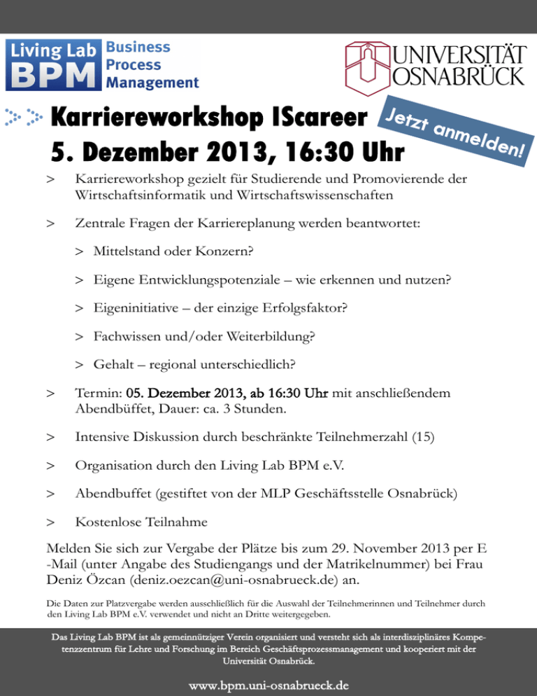 Karriereworkshop IScareer Jetzt anm elde n! 5. Dezember 2013, 16:30 Uhr Karriereworkshop gezielt für Studierende und Promovierende der Wirtschaftsinformatik und Wirtschaftswissenschaften Zentrale Fragen der Karriereplanung werden beantwortet: Mittelstand oder Konzern? Eigene Entwicklungspotenziale – wie erkennen und nutzen? Eigeninitiative – der einzige Erfolgsfaktor? Fachwissen und/oder Weiterbildung? Gehalt – regional unterschiedlich? Termin: 05. Dezember 2013, ab 16:30 Uhr mit anschließendem Abendbüffet, Dauer: ca. 3 Stunden. Intensive Diskussion durch beschränkte Teilnehmerzahl (15) Organisation durch den Living Lab BPM e.V. Abendbuffet (gestiftet von der MLP Geschäftsstelle Osnabrück) Kostenlose Teilnahme Melden Sie sich zur Vergabe der Plätze bis zum 29. November 2013 per E -Mail (unter Angabe des Studiengangs und der Matrikelnummer) bei Frau Deniz Özcan ([email protected]) an. Die Daten zur Platzvergabe werden ausschließlich für die Auswahl der Teilnehmerinnen und Teilnehmer durch den Living Lab BPM e.V. verwendet und nicht an Dritte weitergegeben. Das Living Lab BPM ist als gemeinnütziger Verein organisiert und versteht sich als interdisziplinäres Kompetenzzentrum für Lehre und Forschung im Bereich Geschäftsprozessmanagement und kooperiert mit der Universität Osnabrück. www.bpm.uni-osnabrueck.de