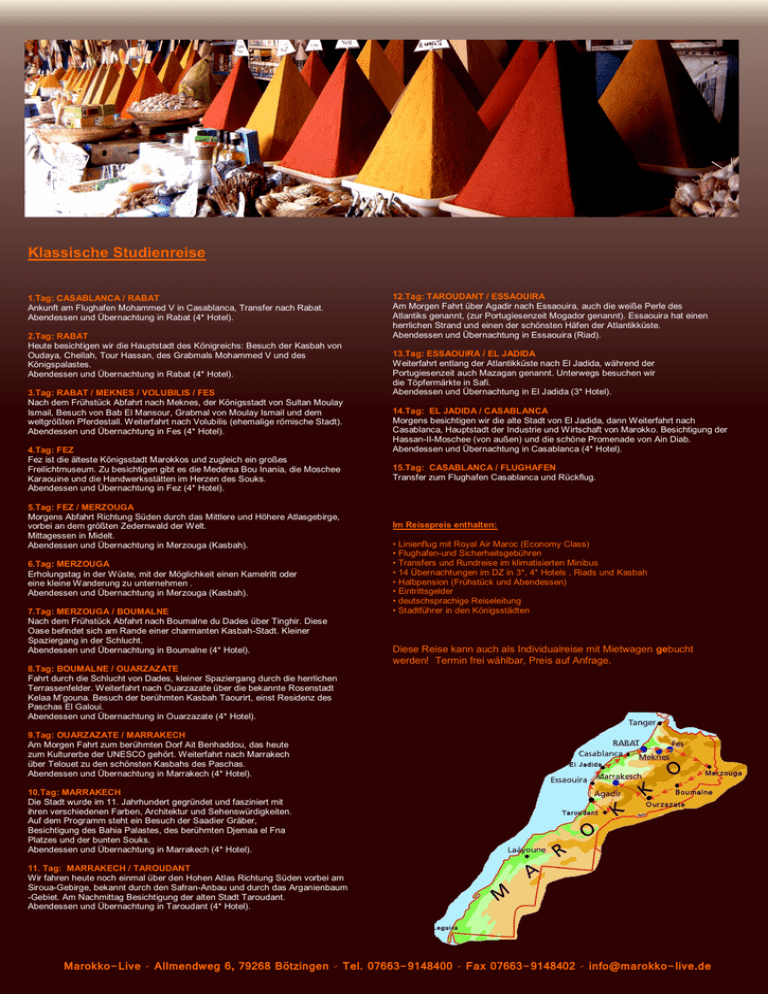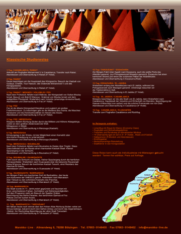 Klassische Studienreise 1.Tag: CASABLANCA / RABAT Ankunft am Flughafen Mohammed V in Casablanca, Transfer nach Rabat. Abendessen und Übernachtung in Rabat (4* Hotel). 2.Tag: RABAT Heute besichtigen wir die Hauptstadt des Königreichs: Besuch der Kasbah von Oudaya, Chellah, Tour Hassan, des Grabmals Mohammed V und des Königspalastes. Abendessen und Übernachtung in Rabat (4* Hotel). 3.Tag: RABAT / MEKNES / VOLUBILIS / FES Nach dem Frühstück Abfahrt nach Meknes, der Königsstadt von Sultan Moulay Ismail, Besuch von Bab El Mansour, Grabmal von Moulay Ismail und dem weltgrößten Pferdestall. Weiterfahrt nach Volubilis (ehemalige römische Stadt). Abendessen und Übernachtung in Fes (4* Hotel). 4.Tag: FEZ Fez ist die älteste Königsstadt Marokkos und zugleich ein großes Freilichtmuseum. Zu besichtigen gibt es die Medersa Bou Inania, die Moschee Karaouine und die Handwerksstätten im Herzen des Souks. Abendessen und Übernachtung in Fez (4* Hotel). 5.Tag: FEZ / MERZOUGA Morgens Abfahrt Richtung Süden durch das Mittlere und Höhere Atlasgebirge, vorbei an dem größten Zedernwald der Welt. Mittagessen in Midelt. Abendessen und Übernachtung in Merzouga (Kasbah). 6.Tag: MERZOUGA Erholungstag in der Wüste, mit der Möglichkeit einen Kamelritt oder eine kleine Wanderung zu unternehmen . Abendessen und Übernachtung in Merzouga (Kasbah). 7.Tag: MERZOUGA / BOUMALNE Nach dem Frühstück Abfahrt nach Boumalne du Dades über Tinghir. Diese Oase befindet sich am Rande einer charmanten Kasbah-Stadt. Kleiner Spaziergang in der Schlucht. Abendessen und Übernachtung in Boumalne (4* Hotel). 8.Tag: BOUMALNE / OUARZAZATE Fahrt durch die Schlucht von Dades, kleiner Spaziergang durch die herrlichen Terrassenfelder. Weiterfahrt nach Ouarzazate über die bekannte Rosenstadt Kelaa M’gouna. Besuch der berühmten Kasbah Taourirt, einst Residenz des Paschas El Galoui. Abendessen und Übernachtung in Ouarzazate (4* Hotel). 12.Tag: TAROUDANT / ESSAOUIRA Am Morgen Fahrt über Agadir nach Essaouira, auch die weiße Perle des Atlantiks genannt, (zur Portugiesenzeit Mogador genannt). Essaouira hat einen herrlichen Strand und einen der schönsten Häfen der Atlantikküste. Abendessen und Übernachtung in Essaouira (Riad). 13.Tag: ESSAOUIRA / EL JADIDA Weiterfahrt entlang der Atlantikküste nach El Jadida, während der Portugiesenzeit auch Mazagan genannt. Unterwegs besuchen wir die Töpfermärkte in Safi. Abendessen und Übernachtung in El Jadida (3* Hotel). 14.Tag: EL JADIDA / CASABLANCA Morgens besichtigen wir die alte Stadt von El Jadida, dann Weiterfahrt nach Casablanca, Hauptstadt der Industrie und Wirtschaft von Marokko. Besichtigung der Hassan-II-Moschee (von außen) und die schöne Promenade von Ain Diab. Abendessen und Übernachtung in Casablanca (4* Hotel). 15.Tag: CASABLANCA / FLUGHAFEN Transfer zum Flughafen Casablanca und Rückflug. Im Reisepreis enthalten: • Linienflug mit Royal Air Maroc (Economy Class) • Flughafen-und Sicherheitsgebühren • Transfers und Rundreise im klimatisierten Minibus • 14 Übernachtungen im DZ in 3*, 4* Hotels , Riads und Kasbah • Halbpension (Frühstück und Abendessen) • Eintrittsgelder • deutschsprachige Reiseleitung • Stadtführer in den Königsstädten Diese Reise kann auch als Individualreise mit Mietwagen gebucht werden! Termin frei wählbar, Preis auf Anfrage. 9.Tag: OUARZAZATE / MARRAKECH Am Morgen Fahrt zum berühmten Dorf Ait Benhaddou, das heute zum Kulturerbe der UNESCO gehört. Weiterfahrt nach Marrakech über Telouet zu den schönsten Kasbahs des Paschas. Abendessen und Übernachtung in Marrakech (4* Hotel). 10.Tag: MARRAKECH Die Stadt wurde im 11. Jahrhundert gegründet und fasziniert mit ihren verschiedenen Farben, Architektur und Sehenswürdigkeiten. Auf dem Programm steht ein Besuch der Saadier Gräber, Besichtigung des Bahia Palastes, des berühmten Djemaa el Fna Platzes und der bunten Souks. Abendessen und Übernachtung in Marrakech (4* Hotel). 11. Tag: MARRAKECH / TAROUDANT Wir fahren heute noch einmal über den Hohen Atlas Richtung Süden vorbei am Siroua-Gebirge, bekannt durch den Safran-Anbau und durch das Arganienbaum -Gebiet. Am Nachmittag Besichtigung der alten Stadt Taroudant. Abendessen und Übernachtung in Taroudant (4* Hotel). Marokko-Live - Allmendweg 6, 79268 Bötzingen - Tel. 07663-9148400 - Fax 07663-9148402 - [email protected]