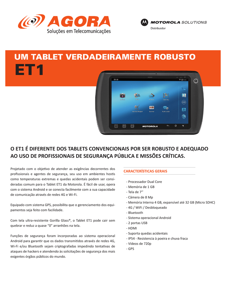 UM TABLET VERDADEIRAMENTE ROBUSTO ET1 O ET1 É DIFERENTE DOS TABLETS CONVENCIONAIS POR SER ROBUSTO E ADEQUADO AO USO DE PROFISSIONAIS DE SEGURANÇA PÚBLICA E MISSÕES CRÍTICAS. Projetado com o objetivo de atender as exigências decorrentes dos profissionais e agentes de segurança, seu uso em ambientes hostis como temperaturas extremas e quedas acidentais podem ser consideradas comum para o Tablet ET1 da Motorola. É fácil de usar, opera com o sistema Android e se conecta facilmente com a sua capacidade de comunicação através de redes 4G e Wi-Fi. Equipado com sistema GPS, possibilita que o gerenciamento dos equipamentos seja feito com facilidade. Com tela ultra-resistente Gorilla Glass®, o Tablet ET1 pode cair sem quebrar e reduz a quase “0” arranhões na tela. Funções de segurança foram incorporadas ao sistema operacional Android para garantir que os dados transmitidos através de redes 4G, Wi-Fi e/ou Bluetooth sejam criptografadas impedindo tentativas de ataques de hackers e atendendo às solicitações de segurança dos mais exigentes órgãos públicos do mundo. CARACTERÍSTICAS GERAIS - Processador Dual Core - Memória de 1 GB - Tela de 7’’ - Câmera de 8 Mp - Memória Interna 4 GB, expansível até 32 GB (Micro SDHC) - 4G / WiFi / Desbloqueado - Bluetooth - Sistema operacional Android - 2 portas USB - HDMI - Suporta quedas acidentais - IP54 - Resistencia à poeira e chuva fraca - Vídeos de 720p - GPS ACESSÓRIO OPCIONAL SUPORTE VEICULAR COM ALIMENTAÇÃO DC PARA DISPOSITIVOS MÓVEIS SVA *O suporte será preso com ventosa no vidro e painel do carro. Projetado para uso em veículos, é leve e robusto permitindo acesso a todas as portas do dispositivo, o que garante mais segurança durante a movimentação. Isto aumenta a eficiência do uso e reduz o potencial de danos no aparelho. Construído com elevados padrões de qualidade, o aparelho foi desenvolvido para suportar as mais severas condições das estradas e temperaturas extremas. As pontas do suporte possuem formas arredondadas, o que dá mais segurança ao usuário durante seu manuseio. Para a inserção ou remoção do dispositivo, o suporte possui um mecanismo de travas, que facilita o transporte e recarga do terminal no veículo ou para sua operação remota. Este suporte permite a recarga da bateria do dispositivo através de cabo de alimentação ligado a tomada 12Vcc do automóvel. DIFERENCIAIS MANTÉM A BATERIA SEMPRE CARREGADA TRABALHA LIGADO A TOMADAS VEICULARES DE 12VCC LIVRE ACESSO ÀS PORTAS DO SEU DISPOSITIVO BRAÇOS COM AJUSTE PARA FIXAÇÃO DO DISPOSITIVO MÓVEL COMPATIBILIDADE COM DISPOSITIVO MÓVEL MOTOROLA, TABLET ET1 CARACTERÍSTICAS TÉCNICAS Dimensões: 245mm x 155mm x 27mm Peso: 0,65kg Tensão de alimentação: 12Vcc/4A Temperatura de operação: -15 a +50°C Sua fixação segue o padrão internacional AMPS de furação, permitindo o uso em vários tipos de montagens como em painel ou pedestal. O suporte não requer modificações na estrutura do veículo, pois usa fixação direta na estrutura do banco do passageiro, facilitando a transferência do suporte para outro automóvel quando necessário. Matriz - SP Rua Fradique Coutinho, 50 - 15º andar Pinheiros - 05416-000 - São Paulo - SP 11 4058-9600 www.agoratelecom.com.br