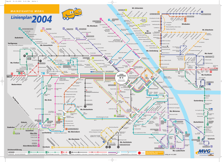 er st dle ra r Ro ße th st ra Ru ße hb st er ra gße A te ar H eu Buslinie mit Haltestelle und Liniennummer tageszeitabhängiger Linienverkehr ße st hn nn ba os ar Ba Re rb eu ra ra ra st sa er Eg zb ße ße g in st hf er oc H m A r- Kr de Pe t St err. S e aß tr ra ße -S rle st Bi llu m ann te ci sw St eg e W ine .- r Sc Leus n S hu ch tr le ne ./ r- tr ns G la aß pl us ul Pa e at z Oppenh. Straße Am Bornberg Dornsh. Weg Mz.-Hechtsheim Bürgerhaus Am Schinnergraben 51 58 50 einzelne Fahrten Straßenbahn mit Haltestelle u. Liniennummer Linienverlauf u. Haltestelle nur in Pfeilrichtung Umsteigehaltestelle m U th 64 Rüsselsheimer Allee Marienhof 63 61 Hans-Zöller-Straße An der Klosterheck Standort Am Leitgraben 63 61 Riedweg Info-Hotline: 0 6131-12 77 77 www.mvg-mainz.de Gültig ab 14.12.2003 In der Nachtweid Schubertstraße 54 Bischofsheim/ Ringstraße An den Sportstätten MAN-Siedlung Stuttgarter Straße 54 Neuweg 52 Umsteigehaltestelle nur in Pfeilrichtung 55 BouguenaisAllee LudwigMarxStraße ße f ho ra st en f ng ho gu ei er w irk bz sB /A ch m Fu ck ie re P + R um ld tr ei e aß es tr e e ße ss ra aß ga r-S ng rle Tö -E St eu er N im tr 55 ge er H an 62 Treburer Straße Bischofsheim Ginsheimer Straße Büdingerstraße 66 55 er Ro 64 Dammweg Mz.-Laubenheim 54 rR el ze d n n ah an 64 65 70 m se n Vo ga lk rte sp n A m ark Ju Vik ge to nd rs t A lte her ift/ r F be rie rge dh Sc Bl of h ei ill H ch o e r h st sc l ra s hu tr ße aß le e Darmstädter Straße Weisenauer Brücke Marktplatz An den Mühlwegen üh en M nc sh itz he r-S alternative Endhaltestelle H Ca s G er Fr rn ue Endhaltestelle Im A 60 e aß rs ge Zur Laubenheimer Höhe Rheinstraße 65 Zeichenerklärung Bürgerhaus Katzenberg/Nelkenweg ür e lsb ic he au en ag H ße ra st er Jä Friedrich-EbertStraße Frankfurter Straße Zementwerk PaulGerhardtWeg Wal Mart Supercenter Weisenau Laubenheimer Straße Bahnhof Am Mainweg Wormser Straße Birkenstraße Robert-Bosch-Straße/ Spedition G. L. Kayser 50 66 Ri e M r. er el St ze rA Sc hm ke üc A rT or Radio Bauer/ Jägerhaus Wilhelm-Maybach-Straße Eb Mz.-Ebersheim Zo na Zornheim st tr Mz.-Marienborn Kardinal-von-Galen-Straße de ße -A ra ad St nr er Ko m ei nh ah H Klein-Winternheim 68 Frankenhöhe Johannes-Kepler-Straße Draiser Straße Bahnhof Am Großberg P+R Am Kupferwerk Mz.-Weisenau W.-Th. RömheldStraße V Lerchenberg Pfarrer-Dorn-Straße Am Beinestein Feuerwache Weisenauer Weg KurmainzKaserne Weisenauer Synagoge er - 6 TÜ Ober-Olm lt e ar 65 64 6A ik en kl in ni Im Borner Grund Am Sonnigen Hang Schott Forschungszentrum Heiligkreuzweg Berliner Straße Bereitschaftspolizei Forsthaus M.-LutherStraße Gustavsburg/ Friedhof ut rW eg he 70 71 Mercedesstraße Bodelschwinghstraße Dr.-Kitz-Straße Favorite-Parkhotel Im r. St Alfred-Mumbächer-Straße Fi th au s er El Ra sh ei m er nz he ai M rc Ki nt r. St le äu ns Lortzingstraße/ ZDF Novo Nordisk 71 Landwehrweg ise ch ei er Alte Ziegelei Pa r ifb r Ta GutenbergCenter Gustavsburg Zitadellenweg/ Südbahnhof Ritterstraße An der Philippsschanze Schule Stadtpark U eg rW te NN rR 70 Unikliniken Süd Mz.-Bretzenheim Ro de Essenheim 71 Waage Brucknerstraße Südbahnhof Am Alten Fährhaus zen us nc ha Vi en k an Kr lt gi re Sa Sc d ar nh er .B St er hi Eh br ra Re rle H a St ns ra -B ße öc k ab Hindemithstraße Elsheim Obere Zahlbacher Straße 52 WilhelmQuetsch-Straße 6A Kostheim/ Mainbrücke Luisenstraße Eisgrubweg H e St c h t ra sh ße ei eg rw eß ze 54 2 61 8 5 62 4 5 63 5 5 71 6 5 7 of dh ie Fr is/ ra D en gr Lindenmühle Hinkelsteinerstraße GutenbergCenter Ost Hebbelstraße 56 33 Holzturm / Fort-Malakoff-Park 66 if Südring GutenbergCenter Nord Winterstraße Viktoriastraße Pfaffen- Altstadt / Holzhof gasse Bahnstraße Menzelstraße Mz.-Kostheim 63 H 62 71 Am Gautor Fichteplatz 58 Viktoriastraße Höfchen/Listmann Schillerplatz Zahlbach Albert-StohrStraße Sampel- Gartenweg weg Rampe Unikliniken 66 le 6 t W es of dh rie Münsterplatz/ Wirth – Der Kinderladen Trajanstraße Römersteine (Hildegardis-Krankenhaus) Vor der Frecht Steinernes Kreuz 610 / Draiser Straße 63 r Ta Mz.-Drais Ratsherrenweg Fischtor le rk sf Hauptbahnhof Essenheimer Straße Römerstraße St. Veiter Platz Klagenfurter Straße Details siehe Taschenfahrplan Am Brand al zi 66 Arbeitsamt Brückenplatz/ Landtag 28 Bauhofstraße/LRP Details siehe Ta s c h e n f a h r p l a n 62 63 66 71 62 Draiser Weg Kastel/Bahnhof dh ol ng s ei au Rh ath R Be Neubrunnenstraße hu pe st lle ra n ße - Ka rg lle be ha Universität Ka M tz ar en kt ar M e eu N 6 6 A 9 28 52 54 55 56 57 58 64 65 68 54 55 58 68 Martin-Kirchner-Straße 57 Kiefernstraße Hauptbahnhof West/ Taubertsbergbad Neubrunnenplatz/ Römerpassage Botanischer Garten Krautgärten 33 57 Kostheim/ Hallenbad Brückenkopf 50 51 52 of La l l ye e A Ch nh tr iu aus öfe m se r e M Hot ai el nz nh ha ye H La kt l l oh oh H ne ße Wallstraße Ludwig-Nauth-Straße Ober-Olmer Straße Mz.-Kastel r te ar lg e al aß H Str ei Hindenburgplatz/ Architektenkammer RLP Lessingstraße Hauptfriedhof 71 Stadecken Kurfürstenstraße Baentschstraße Südwestrundfunk 56 Eleonorenstraße Mainz Hauptbahnhof Ackermannweg Roonstraße Johs.- Goßner-Straße ße ra St er nz Li er m ei hh e oc ß H tra S ro Fritz-Kohl-Straße Goethestraße Backhaushohl Curt-GoetzStraße Ludwigsplatz Sömmerringstraße 28 56 57 DanielBrendelStraße Otto-Suhr-Ring Gabelsbergerstraße P+R Koblenzer Straße Ochsenbrunnenweg Kastel/Friedhof Kaisertor/ Stadtbibliothek Bismarckplatz Goetheunterführung King-Park-Center/ Stadion 05 Friedrich-vonPfeiffer-Weg/ Bausparkasse Mainz Flugplatz Fort Biehler 57 G s au rh Kl te Wackernheim Mudra-Kaserne Ruthof Goetheplatz 9 An der Dreispitz Kisselberg/Allg. Kredit Coface Lorenz-SchottStraße Mz.-Amöneburg Feldbergplatz Zwerchallee Am Fort BerufsschulGonsenheim zentrum SchützenHartenberg/ haus Ketteler-Kolleg of nh ße ra st 57 se Ro l ge 70 55 58 56 Dijonstraße Mombacher Tor Am Judensand 65 Am Jugendwerk e H