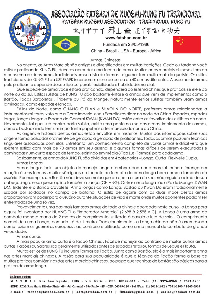 ASSOCIAÇÃO FATSHAN DE KuOSHU-KUNG FU TRADICIONAL FATsHAN KUOSHU ASSOCIATION - TRADItIONAL KUNG FU U S K www.fatshan.com.br F Fundada em 23/05/1986 China - Brasil - USA - Europa - África Armas Chinesas No oriente, as Artes Marciais são antigas e diversificadas em muitas tradições. Cedo ou tarde se você estiver praticando KUNG FU, deverás aprender uma forma de arma. Muitas artes marciais chinesas tem ao menos uma ou duas armas tradicionais em sua lista de formas – algumas tem muito mais do que isto. Os estilos tradicionais de KUNG FU da USKF/AFK incorporam o uso de cerca de 40 armas diferentes. A escolha de armas pelo praticante depende do seu tipo corporal, flexibilidade e habilidade marcial. Que espécie de arma você estará praticando, dependerá do sistema chinês que praticas, se ele é do norte ou do sul. Estilos sulistas de KUNG FU dão bastante ênfase a armas que vem de implementos como o Bastão, Facas Borboletas , Tridente ou Pá do Monge. Naturalmente estilos sulistas também usam armas laminadas , como espadas e lanças. Estilos do Norte, como CHANG CH'UAN e SHAOLIN DO NORTE, preferem armas relacionadas a instrumentos militares, visto que a Corte Imperial e seu Exército residiam no norte da China. Espadas, espadas largas, lanças longas e Espada do General KWAN (KWAN DO) estão entre as favoritas dos estilistas do norte. Novamente, tal qual sua contra-parte sulista, existe uma ponte no uso das armas. Implemento das armas, como o bastão ainda tem um importante papel nas artes marciais do norte da China. As origens e histórias destas armas estão envoltas em mistérios. Muitas das informações sobre suas origens forma passadas oralmente de geração a geração de praticantes. Todas as armas possuem técnicas singulares associadas com elas. Entretanto, um conhecimento completo de várias armas é difícil visto que existem estilos com mais de 70 armas em seu arsenal e algumas formas difíceis de serem executadas e dominadas num curto espaço de tempo, existindo em média 8 Tao Lus (Formas) para cada arma. Basicamente, as armas do KUNG FU são divididas em 4 categorias – Longa, Curta , Flexível e Dupla. Armas Longas Armas longas inclui um objeto de manejo longo e embora cada arte marcial tenha diferença em relação à suas formas , muitas são iguais no tocante ao formato da arma longa bem como o tamanho do usuário. Por exemplo, um Bastão não deve ser maior que do que a altura de sua mão erguida acima de sua cabeça, regra essa que se aplica também a Lança (CHIANG). Outras arma longa são a Pá do Monge , KWAN DO, Tridente e o Banco Cavalete. Arma longas como Lança, Bastão ou Kwan Do eram tradicionalmente usadas por soldados no campo de batalha. O estilo de agarre com as duas mãos destas armas proporcionavam poder para o usuário durante situações de vida e morte onde muitos oponentes podiam ser enfrentados de uma só vez. Provavelmente uma das mais famosas armas de toda a china e abordada neste curso , a Lança para alguns foi inventada por HUANG TI, o “Imperador Amarelo” (2.698 à 2.598 A.C). A Lança é uma arma de combate mano-a-mano de 2 metros de comprimento, utilizada à cavalo e luta de solo. O comprimento normal deu uma Lança, contudo , é de 1 metro. Tradicionalmente , a Lança chinesa não é arremessada como faziam os guerreiros europeus , ao contrário é utilizada como arma manual de combate de grande velocidade. Armas curtas A mais popular arma curta é o facão Chinês . Fácil de manejar ao contrário de muitas outras armas curtas, Facões ou Sabres são geralmente utilizadas antes de espadas retas ou formas de Leque e Flauta. Muitos estilos de KUNG FU incluem Formas de Facão. Junto com o Bastão, ela é a mais importante arma nas artes marciais chinesas. A razão para sua popularidade é que a técnica do Facão forma a base de muitas praticas com lâminas das artes marciais chinesas, ao passo que técnicas de bastão são básicas para a prática de arma longa. Informações M A T R I Z: Rua Araritaguaba, 1135 - Vila Maria - CEP: 02122-011 - Tel.: (11) 9976-8968 / 7571-1200 SEDE ADM: Rua Mario Ribeiro Pinto, 48 - Jd. Oriental - São Paulo - SP - CEP: 04349-180 - Tel./Fax: (11) 5011-1642 / 7571-1200 / 9345-6914 E-mails: [email protected] | [email protected] | [email protected] | [email protected] O que se evita : Há poucas coisas a evitar quando praticando e demonstrando qualquer forma de arma. 1º, não golpeie a si mesmo ou alguém próximo. Golpeando acidentalmente algo, inclusive o solo, com sua arma indica uma perda de controle. Certamente, se a arma for cortante , você pode mesmo machucar a si mesmo com o canto da lâmina Sua arma deve estar sempre em boa condição, com todos os parafusos firmemente no lugar. Nada é mais embaraçante que ter a ponta de sua lança voando fora durante a forma. Cabeças de armas soltas são também perigosas Embora sua concentração esteja em sua arma e forma , esteja atento a pessoas e objetos ao redor de você. Outros estudantes devem esperar até você ter terminado sua forma, antes de caminhar dentro da Academia. Infelizmente, ninguém lembra desta regra e cortesia. E deve sempre ser alguém que caminhe a sua frente que deve ser observado, assim que você oscilar seu bastão ou espada, estando deste modo preparado para parar quando perceber movimento perto de você. Objetos inanimados, como espelhos, são alguns alvos prediletos de estilistas desatentos. Fique longe de objetos quebráveis. Finalmente, encontre você mesmo um respeitado Professor , que saiba e entenda as formas de armas que esta ensinando. Conhecer as características e aplicações de cada arma são dever de todo Instrutores de arte Marcial. Seu professor deve estar familiarizado com as técnicas que tornam cada forma uma representação das autênticas artes marciais chinesas. Não há nada pior do que uma pobre forma de arma. Garfo do tigre Esta antiga arma tem origem no sudeste da China e era utilizada como uma