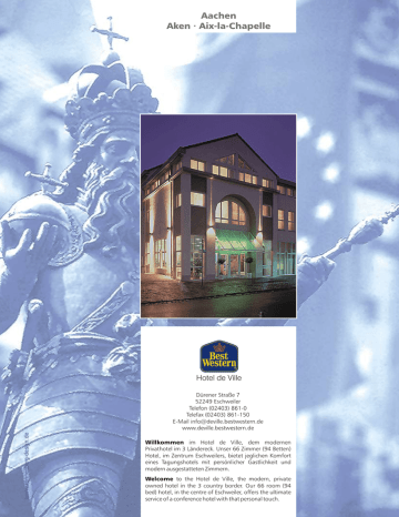 Aachen Aken · Aix-la-Chapelle Hotel de Ville Dürener Straße 7 52249 Eschweiler Telefon (02403) 861-0 Telefax (02403) 861-150 E-Mail [email protected] www.deville.bestwestern.de Willkommen im Hotel de Ville, dem modernen Privathotel im 3 Ländereck. Unser 66 Zimmer (94 Betten) Hotel, im Zentrum Eschweilers, bietet jeglichen Komfort eines Tagungshotels mit persönlicher Gastlichkeit und modern ausgestatteten Zimmern. Welcome to the Hotel de Ville, the modern, private owned hotel in the 3 country border. Our 66 room (94 bed) hotel, in the centre of Eschweiler, offers the ultimate service of a conference hotel with that personal touch. Tagungsräume Conference rooms Fläche area (m2) Hotel de Ville Miro Van Gogh Picasso Dali Personen Personen Personen (Stuhlreihen/ (Parlament(Bankettrow seating) bestuhlung/ bestuhlung/ classroom) banquett) 120 70 120 70 20 18 20 16 - 160 120 37 35 Personen (Stehempfang/ reception) 150 100 - Miro Picasso Dali Van Gogh Technische Ausrüstung Technical equipment Tageslichtprojektor Pinwand Leinwand Flip-Chart Diaprojektor Videorecorder/Farbfernseher Videokamera 8 mm Moderatorenkoffer Mikroanlage Beamer overhead projector pin board screen flip-chart slide projector video projector/colour TV video camera 8 mm working case for moderator microphones beamer Hotelzimmer Rooms Doppelzimmer twin rooms Einzelzimmer single rooms Behindertenzimmer rooms f. handicapped guests Tiefgarage underground car park So finden Sie zu uns Your way to our hotel 28 38 1 20