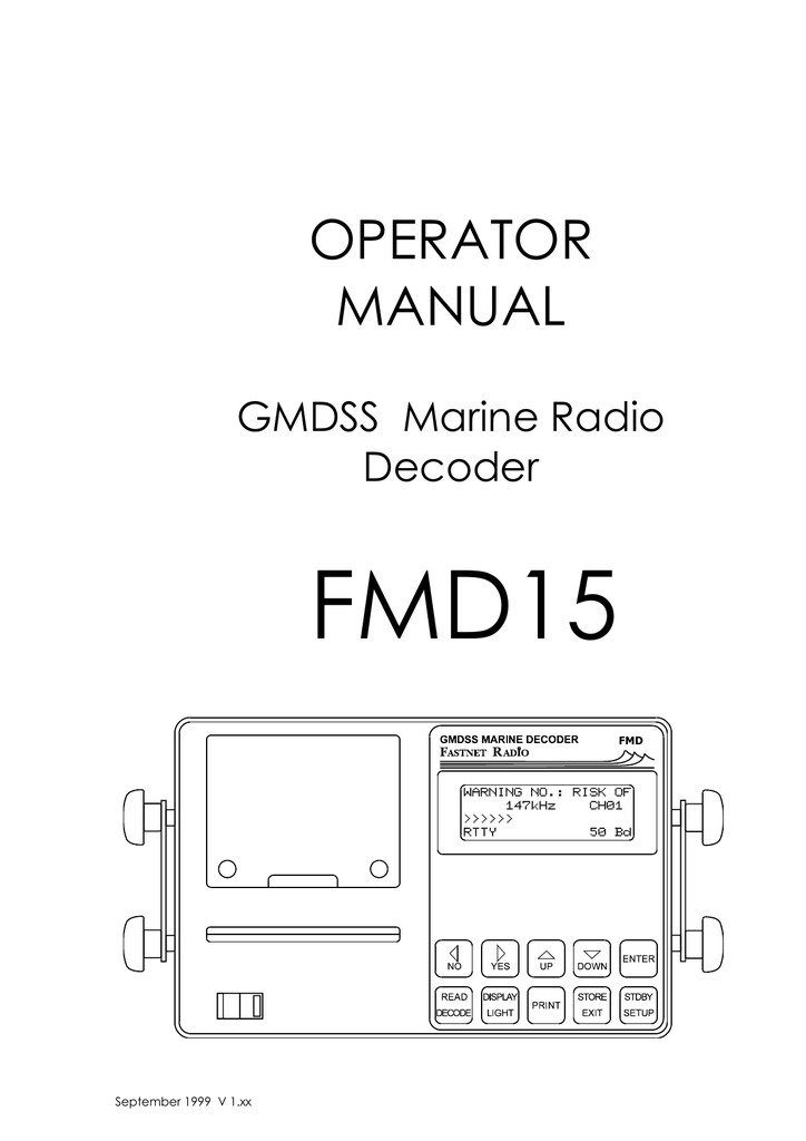 OPERATOR MANUAL GMDSS Marine Radio Decoder FMD15 FMD September 1999 V 1.xx ATTENTION IMPORTANT INFORMATION The FMD15 has two M5 threaded holes on either side for the supplied thumb screws, so that it can be fitted to the universal mounting bracket. The length of the thumb screws has been so determined, that, together with the bracket and the lock washers, they can only penetrate approx. 5mm into the thread. Should you use alternative fitting methods or screws, please make sure that they do not penetrate the thread by more than 5mm. By using longer screws, the integrated electronic could be damaged !! September 1999 V 1.xx Contents 1. 2. 3. 1.1. 1.2. 1.3. 2.1. 3.1. 3.2. 3.3. 3.4. 4. 5. 4.1. 4.1.1. 4.1.2.. 4.2. 4.3. 4.4 5.1. 5.2. 5.3. 5.4. 5.5. 5.6. 5.7. 5.8. 5.9. 5.10. Page Introduction 4. Receiver 6. Decoding of messages 7. Message Transmission Types 8. Short description Operation Keypad functions Operation Selecting mode and decoding 4. 4. 5. 6. 7. Programming of channels Recalling of stored channels Message memory 9. 10. 11. Automatic reception and decoding 12. NAVTEX, reception and decoding 18. Programming the timer function Input of new ON/OFF times Deleting ON/OFF times Interrupting and restarting the timer Reading stored messages Printing out stored messages Section of transmitting station Selecting type of message Printer function Suppressing repeated messages Alarm for A, B and D messages Printing out parameter status Returning to standby mode Displaying and dealing with errors Termination by high error rate List of NAVTEX transmission stations September 1999 V 1.xx 13. 13. 14. 15. 15. 16. 19. 19. 20. 21. 21. 21. 22. 22. 22. 23. 6. Unoccupied 7. 7.1. 7.2. NMEA, printer and navigation log Printing of NMEA data Activating log 26. 8.1. 8.2. 8.3. 8.4. System (SET UP) Setting of time and date Setting of owner’s and vessel’s name Printing out system data status Memory store deletion and reset 30. 30. 31. 32. 33. Installation 34. FMD15 Accessories 46. 8. 9. 9.1. 9.2. 9.3. 9.4. 9.5. 9.6. 9.7. 9.8. 10. 10.1. 10.2. 10.3. 10.4. 10.5. 10.6. 10.7. Delivery contents Installation of unit Dimensions Table and ceiling installation Power supply connection NMEA interface connection Antenna and earth connection Installation of long-wire antenna on back-stay Installation of active antenna MD-AA Installation of R+R active antenna Printer paper change Active antenna power supply LF audio out-put 24V DC/DC converter DC/DC converter installation DC936-DC/DC converter for 9-36V to 12V MD-AA - active antenna MLB – marine long-wire balun for back-stay F3A and F6A suppression filters M20-ALS – active loudspeaker for FMD15 September 1999 V 1.xx 26. 27. 34. 34. 36. 37. 38. 39. 39. 40. 41. 42. 43. 45. 45. 46. 46. 47. 48. 49. 50. 51. 11. . 12. 13. 14. 11.1. 11.2. 11.3. 11.4. Technical data General Receiver Micro controller Signal processor decoder 52. 11.5. 11.6. 11.7. 11.8. 11.9. LCD display Thermal printer NMEA interface Power supply for active antenna Approvals 53. 53. 53. 53. 53. General Information and transmitting stations 54. Examples 61. Appendix 65. 12.1. 12.3. 12.4. 12.5. 12.6. 13.1. 13.2. 13.3. 13.4. 13.5. 14.1. 14.2. 14.3. 14.4. 14.5 Stations, frequencies and transmission times Wind forces Sea swell Antenna reception on board Morse code tables Status print out of timer parameters Baltic / North Seas NAVTEX reports print out Print out of weather report Print out of navigation log NAVTEX parameter status print out Service and Maintenance Service depots Warranties Software maintenance Software up-date enquiry form Error alarm 14.5.1. “PRINTER ERROR” alarm 14.5.2. Further acoustic alarms September 1999 V 1.xx 52. 52. 52. 53. 54. 55. 56. 57. 59. 61. 62. 63. 64. 64. 65. 65. 67. 68. 69. 70. 70. 71. 1. Introduction 1.1. Short Description The Fastnet functions: marine decoder FMD15contains the following a) Receiver a high quality receiver with the following important features: Range : 1 pre-programmed channel from 100 kHz to 13 MHz : 1 pre-programmed channel 518.0 kHz for NAVTEX Modes : FSK and CW b) Morse, Telex and SITOR Decoder By means of a PLL signal processor and an integrated microcomputer the following codes are automatically deciphered: Morse code signs : 40 to 100 Bpm RTTY (radio teletype) : 50 Baud SITOR FEC : 100 Baud (NAVTEX) d) NMEA printer and navigation log Print out of data via the NMEA interface. When connected to a GPS, a navigation log can be stored and printed out. 1.2. Operation The back-lit, high contrast LCD display and an easy to use keypad, allow a user friendly operation of the FMD15. System information and stored decoded messages can be printed out by the integrated thermal printer on 80mm paper 1.3. Keypad Functions cursor to the left answer <NO> cursor to the right answer <YES> cursor upwards scroll upwards increase values cursor downwards decrease values confirm entry activate cursor position read memory contents start decoding display memory contents switch on back-lighting start printing select (P) print and/or (W) write print space return to higher menu level end process return to standby mode g SET UP menu 1. Receiver 1.1. Operation The receiver requires practically no operation. The NAVTEX frequency (518.0 kHz) is pre-programmed Further this model has one further pre-programmed frequency, according to a defined sailing region. The frequencies of a transmitting station are normally set down internationally and are rarely changed. However, this preprogrammed frequency has been allotted the following parameters: Morse RTTY SITOR-FEC The message decoding mode has not been laid down, as it is expected, that, in the next few years, various stations will change their transmission from Morse or RTTY to SITOR-FEC. On the following pages you can find a list of the present codes used. It is not necessary to adjust the mode in the receiver. This is done automatically, when selecting the decoding mode. 3. Decoding of Messages The FMD15 can store and decipher NAVTEX, MORSE, R