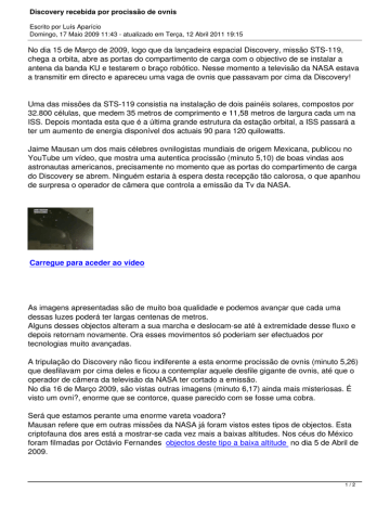 Discovery recebida por procissão de ovnis Escrito por Luís Aparício Domingo, 17 Maio 2009 11:43 - atualizado em Terça, 12 Abril 2011 19:15 No dia 15 de Março de 2009, logo que da lançadeira espacial Discovery, missão STS-119, chega a orbita, abre as portas do compartimento de carga com o objectivo de se instalar a antena da banda KU e testarem o braço robótico. Nesse momento a televisão da NASA estava a transmitir em directo e apareceu uma vaga de ovnis que passavam por cima da Discovery! Uma das missões da STS-119 consistia na instalação de dois painéis solares, compostos por 32.800 células, que medem 35 metros de comprimento e 11,58 metros de largura cada um na ISS. Depois montada esta que é a última grande estrutura da estação orbital, a ISS passará a ter um aumento de energia disponível dos actuais 90 para 120 quilowatts. Jaime Mausan um dos mais célebres ovnilogistas mundiais de origem Mexicana, publicou no YouTube um vídeo, que mostra uma autentica procissão (minuto 5,10) de boas vindas aos astronautas americanos, precisamente no momento que as portas do compartimento de carga do Discovery se abrem. Ninguém estaria à espera desta recepção tão calorosa, o que apanhou de surpresa o operador de câmera que controla a emissão da Tv da NASA. Carregue para aceder ao vídeo As imagens apresentadas são de muito boa qualidade e podemos avançar que cada uma dessas luzes poderá ter largas centenas de metros. Alguns desses objectos alteram a sua marcha e deslocam-se até à extremidade desse fluxo e depois retornam novamente. Ora esses movimentos só poderiam ser efectuados por tecnologias muito avançadas. A tripulação do Discovery não ficou indiferente a esta enorme procissão de ovnis (minuto 5,26) que desfilavam por cima deles e ficou a contemplar aquele desfile gigante de ovnis, até que o operador de câmera da televisão da NASA ter cortado a emissão. No dia 16 de Março 2009, são vistas outras imagens (minuto 6,17) ainda mais misteriosas. É visto um ovni?, enorme que se contorce, quase parecido com se fosse uma cobra. Será que estamos perante uma enorme vareta voadora? Mausan refere que em outras missões da NASA já foram vistos estes tipos de objectos. Esta criptofauna dos ares está a mostrar-se cada vez mais a baixas altitudes. Nos céus do México foram filmadas por Octávio Fernandes objectos deste tipo a baixa altitude no dia 5 de Abril de 2009. 1/2 Discovery recebida por procissão de ovnis Escrito por Luís Aparício Domingo, 17 Maio 2009 11:43 - atualizado em Terça, 12 Abril 2011 19:15 Este vídeo de Jaime Mausan, também mostra imagens (minuto 4,05) dum ovni gigante estacionado no céu, perto da passagem da Discovery, quando esta lançadeira espacial se elevava a partir do Cabo Canaveral na Florida. Estas imagens do lançamento não forma captadas pela NASA, foram feitas por particulares perto da zona dos lançamentos no Cabo Canaveral. A presença de ovnis nos lançamentos, é uma das preocupações da NASA, daí que, quando a as lançadeiras espaciais chegam, a televisão da NASA já não as transmite em directo. Essas chegadas eram aproveitadas por ovnis que se iam meter mesmo ao lado das lançadeiras para poderem ser filmados. Notamos assim que os ovnis comportam-se de duas maneiras: Primeira, são esquivos e não querem ser filmados. Segunda, querem ser filmados e vão colocar-se mesmo no enfiamento da visão das câmeras para apareceram na TV. Podemos ironizar, tentando ouvir o raspanete que o operador de câmera levou dos seus superiores, por deixar passar estas imagens. O operador de câmera costuma ser muito zeloso do seu serviço e podemos ir buscar um exemplo a um artigo publicado aqui na APO com o titulo «OVNI com vários quilómetros de diâmetro» no qual apareceu de forma repentina um ovni. De imediato o operador que estava em terra, corta a emissão e coloca o mapa com as curvas sinusoidais que está presente da sala de controlo. De seguida foca a câmera numa fonte de luz no exterior de lançadeira espacial e começa lentamente a desviar a imagem. Para sua desgraça e apesar do seu profissionalismo, o ovni que foi visto antes era redondo e a imagem do foco de luz era hexagonal, devido ao diafragma interno da câmera. Nesta missão STS-119, a NASA informou ter detectado, através de fotos, a presença de um morcego agarrado ao tanque externo laranja da nave, momentos antes do lançamento. Especialista em vida selvagem disseram que o animal parecia estar com a asa esquerda quebrada e com algum problema no pulso ou ombro direito, acredita-se que ele tenha morrido rapidamente durante a rápida subida do Discovery até a órbita terrestre. Luís Aparício AAA 2/2