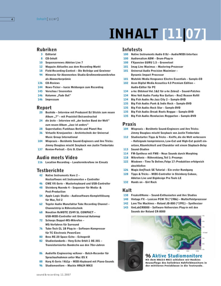 4 Inhalt[11|07] INHALT [11|07] Rubriken Infotests 3 Editorial 100 Native Instruments Audio 8 DJ – Audio/MIDI-Interface 8 CD-Inhalt 100 Audiorealism ADM – Drum-Plug-in 10 Sequenzernews: Ableton Live 7 100 FXpansion GURU 1.5 – Groovetool 12 Magazin: Aktuelles aus dem Recording-Markt 101 Imag Line Maximus – Mastering-Prozessor 18 Field-Recording-Contest – Die Beiträge und Gewinner 101 Universal Audio Precision Maximizer – 94 Hinweise für Abonnenten: Studio-Großmembranmikrofon Dynamic Impact Processor als Abowerberprämie 101 Mutekki Media Vengeance Electro Essentials – Sample-CD 136 CD-Reviews 102 Acon Digital Media Acoustica 4.0 Premium Edition – 144 News-Ticker – kurze Meldungen zum Recording 145 Vorschau / Inserenten 134 u-he: Oldskool Vol. 1&2 für u-he Zebra2 – Sound-Patches 146 Kolumne „Fade Out” 134 Nine Volt Audio: Funky Rex Guitars – Rex2 Reason Refill 146 Impressum 134 Big Fish Audio: Nu Jazz City 2 – Sample-DVD 135 Big Fish Audio: Punk & Indie Rock – Sample-DVD 135 Big Fish Audio: Rock Star – Sample-DVD Bushido – Interview mit Produzent DJ Stickle zum neuen 135 Big Fish Audio: Dread: Roots Reggae – Sample-DVD Album „7” – mit Praxisteil De/constructed 135 Big Fish Audio: Revolucion: Reggaeton – Sample-DVD Report 20 24 die ärzte – Interview mit „der besten Band der Welt” zum neuen Album „Jazz ist anders” 28 Superstudios: Funkhaus Berlin und Planet Roc 36 Virtuelle Kronjuwelen – Archivtechnik der Universal Music Group International 104 Audio-Editor für PC Praxis 104 Jimmy Douglass mischt Sexyback von Justin Timberlake 112 Mixpraxis – Berühmte Sound-Engineers und ihre Tricks: Review-Portrait – Eric D. Clark Audio meets Video 116 Location Recording – Lavaliermikrofone im Einsatz Studiostarter:Tipps & Tricks – Kniffe, die die Welt verbessern – Hallsignale komprimieren, Low-Cut und High-Cut gezielt einsetzen, Räumlichkeit und Charakter mit einem Slapback-Delay Jimmy Douglass mischt Sexyback von Justin Timberlake 137 Mixpraxis – Berühmte Sound-Engineers und ihre Tricks: 113 Sound-Studien 114 FM-Synthese mit FM8 – Neue Sounds durch Morphing 118 Mikrofonie – Röhrenklang,Teil 1: Preamps 122 Mixdown – Time To Deliver, Folge 17: Produktion erfolgreich abschließen Testberichte 42 Native Instruments Kore 2 – 126 Magix Am|Track SE Tutorial – Ein erster Rundgang 128 Tipps & Tricks – MIDI-Controller in Steinberg Cubase, Ableton Live und Digidesign Pro Tools LE Hostsoftware mit Instrumenten + Controller 46 CME VX-Serie – Masterkeyboard und USB-Controller 48 Steinberg Nuendo 4 – Sequenzer für Media- & Post-Production 54 62 68 132 Hands on – Girl Rock Kult Apple Logic Studio – Audiosoftware-Komplettlösung 138 Freaks@Home – Sound-Enthusiasten und ihre Studios für Mac,Teil 2 140 Vintage FX – Lexicon PCM 70 (*1986) – Multieffektprozessor Tegeler Audio Manufaktur Tube Recording Channel – 142 Love The Machines – Roland JD-800 (*1991) – Synthesizer Channelstrip in Röhrentechnik 143 ltmLabCR8000 – Software-Vollversion: Plug-in mit den Novation ReMOTE 25/49 SL COMPACT – Sounds der Roland CR-8000 USB-MIDI-Controller mit Universal Automap 72 Schoeps Doppel-MS-Mikrofon – MS-Verfahren für Surround 76 Tube-Tech CL 1B Plug-in – Software-Kompressor für TC Electronic PowerCore 80 Boss RE-20 Space Echo – Echogerät 82 Studiostandards – Vorg Echo Orbit-1 OE-301 – Transistorisiertes Bandecho aus den 70er-Jahren 86 Audiofile Engineering voXover – Batch-Recorder für Sprachaufnahmen unter Mac OS X 88 Korg K-Serie / K61p – MIDI-Keyboard mit Piano-Sounds 96 Studiomonitore – Mackie HR624 MKII sound & recording 11.2007 96 Aktive Studiomonitore Mit dem HR624 MKII schicken wir Mackies Neuauflage des beliebten Nahfeldmonitors in der mittleren Preisklasse in die Testrunde. [11|07]Inhalt 104 Mixpraxis Sexyback von Justin Timberlake und Timbaland war einer der größten und gewiss auch ungewöhnlichsten Hits des Jahres 2006. In den USA und Großbritannien sowie einem knappen Dutzend weiterer Länder landete der Track auf Nummer 1. In der Media Traffic United World Chart 2006 belegte Sexyback Platz 3 (hinter Shakiras Hips Don’t Lie und Crazy von Gnarles Barkley). Außerdem erhielt die Single einen Grammy als Best Dance Recording. Für unsere Mixpraxis-Serie befragten wir den Engineer und Produzenten Jimmy Douglass, zu dessen jüngeren Credits Namen wie Ginuwine, Aaliyah, Lenny Kravitz, Missy Elliot, Sean Paul und natürlich Justin Timberlake gehören. Außerdem hat er das neue DuranDuran-Album gemischt sowie einige Songs auf Björks Album Volta. 48 Steinberg Nuendo 4 Sequenzer für Media- & Post-Production 72 Schoeps Doppel-MS-Mikrofon MS-Verfahren für Surround 28 Superstudios: Funkhaus Berlin und Planet Roc Post-Bauhaus-Ästhetik und realsozialistisches Flair gehen auf dem alten ostdeutschen Rundfunkgelände eine einmalige Verbindung ein. Gegenwärtig erwacht das 13 Hektar große Areal aus dem Nachwende-Dornröschenschlaf. Für unsere Reihe „Studios der Superlative“ besuchte unser Autor Hannes Bieger das Funkhaus Berlin sowie das legendäre Planet Roc Studio. Der gesamte Gebäudekomplex beherbergte eine Vielzahl von Studios von der Synchronkabine bis zum mehrere hundert Quadratmeter großen Orchestersaal. 62 Tegeler Audio Manufaktur Tube Recording Channel Channelstrip in Röhrentechnik sound & recording 11.2007 5 8 Inhalt[CD] INHALT [CD] CD-Audio Klangbeispiele auf CD: Track 01: Intro (01:31 Min.) Track 02: Field-Recording-Contest (02:44 Min.) Seite 018 Track 03: Native Instruments Kore 2 (10:47 Min.) Seite 042 Track 04: Tube-Tech CL-1B Plug-in für TC Powercore (01:12 Min.) Seite 076 Track 05: Acon Digital Media Acoustica 4 (01:21 Min.) Seite 102 Track 06: Boss RE-20 (03:21 Min.) Seite 080 ACID-Loops vom Roland JD-800 Track 07: Vorg Echo Orbit EO-301 (01:22 Min.) Seite 082 Artikel auf Seite 142 Track 08: u-he Zebra 2 Oldskool 1 und 2 (01:46 Min.) Seite 134 Track 09: Time to Deliver – Das