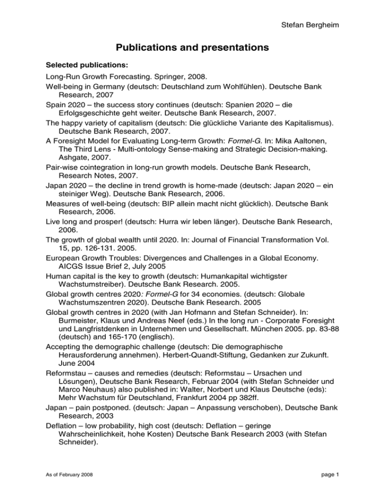 Stefan Bergheim Publications and presentations Selected publications: Long-Run Growth Forecasting. Springer, 2008. Well-being in Germany (deutsch: Deutschland zum Wohlfühlen). Deutsche Bank Research, 2007 Spain 2020 – the success story continues (deutsch: Spanien 2020 – die Erfolgsgeschichte geht weiter. Deutsche Bank Research, 2007. The happy variety of capitalism (deutsch: Die glückliche Variante des Kapitalismus). Deutsche Bank Research, 2007. A Foresight Model for Evaluating Long-term Growth: Formel-G. In: Mika Aaltonen, The Third Lens - Multi-ontology Sense-making and Strategic Decision-making. Ashgate, 2007. Pair-wise cointegration in long-run growth models. Deutsche Bank Research, Research Notes, 2007. Japan 2020 – the decline in trend growth is home-made (deutsch: Japan 2020 – ein steiniger Weg). Deutsche Bank Research, 2006. Measures of well-being (deutsch: BIP allein macht nicht glücklich). Deutsche Bank Research, 2006. Live long and prosper! (deutsch: Hurra wir leben länger). Deutsche Bank Research, 2006. The growth of global wealth until 2020. In: Journal of Financial Transformation Vol. 15, pp. 126-131. 2005. European Growth Troubles: Divergences and Challenges in a Global Economy. AICGS Issue Brief 2, July 2005 Human capital is the key to growth (deutsch: Humankapital wichtigster Wachstumstreiber). Deutsche Bank Research. 2005. Global growth centres 2020: Formel-G for 34 economies. (deutsch: Globale Wachstumszentren 2020). Deutsche Bank Research. 2005 Global growth centres in 2020 (with Jan Hofmann and Stefan Schneider). In: Burmeister, Klaus und Andreas Neef (eds.) In the long run - Corporate Foresight und Langfristdenken in Unternehmen und Gesellschaft. München 2005. pp. 83-88 (deutsch) and 165-170 (englisch). Accepting the demographic challenge (deutsch: Die demographische Herausforderung annehmen). Herbert-Quandt-Stiftung, Gedanken zur Zukunft. June 2004 Reformstau – causes and remedies (deutsch: Reformstau – Ursachen und Lösungen), Deutsche Bank Research, Februar 2004 (with Stefan Schneider und Marco Neuhaus) also published in: Walter, Norbert und Klaus Deutsche (eds): Mehr Wachstum für Deutschland, Frankfurt 2004 pp 382ff. Japan – pain postponed. (deutsch: Japan – Anpassung verschoben), Deutsche Bank Research, 2003 Deflation – low probability, high cost (deutsch: Deflation – geringe Wahrscheinlichkeit, hohe Kosten) Deutsche Bank Research 2003 (with Stefan Schneider). As of February 2008 page 1 Stefan Bergheim Migration in Germany – redistribution of a shrinking population (deutsch: Migration in Deutschland: Umverteilung einer schrumpfenden Bevölkerung), Deutsche Bank Research, 2003 Fiscal consolidation – wishful thinking and harsh reality (deutsch: Haushaltskonsolidierung: Wunschdenken und harte Realität) Bottleneck labour – an empirical growth analysis (deutsch: Engpassfaktor Arbeit – eine empirische Wachstumsanalyse), Deutsche Bank Research, November 2002 (with Marco Neuhaus) also published in: Walter, Norbert und Klaus Deutsche (eds): Mehr Wachstum für Deutschland, Frankfurt 2004 pp 71ff. All eyes on German inflation in January. In: Global Data Watch. JP Morgan. January 2002. German politics: Stoiber vs. Schroeder. In: Global Data Watch. JP Morgan. January 2002. The Euro area MCI’s failure as a policy guide. In: Global Data Watch. JP Morgan. November 2001. German Monitor -Quarterly Review of Economics and Strategy. Merrill Lynch. December 2000 and earlier quarters. Germany On A Roll Again - Survey of Recent Structural Changes and Their Market Impact. Merrill Lynch. September 2000. German Pension Reform: two more steps to go. Merrill Lynch. June 2000 (mit Jan Mantel) German Tax Changes - The Impact of the Tax-Free Disposal of Shareholdings. Merrill Lynch. January 2000. Eichel’s Turnaround -The New Direction of German Fiscal Policy and its Consequences. Merrill Lynch July 1999. Lafontaine’s First Budget. Merrill Lynch. January 1999. Schröder's Choice - Special Report on the Result of the German Federal Election. Merrill Lynch. September 1998 (with Holger Schmieding). Election Arithmetic - Red-Green or Grand Coalition? Merrill Lynch. September 1998. Newspaper articles and book reviews: Warum in einer flachen Welt jeder die gleichen Chance hat. Besprechung von „Die Welt ist flach“ von Thomas Friedman. Die Zeit 21.9.2006. Hurra wir leben länger. Die Welt. Geldwerter Vorteil. Gastkommentar zur Bedeutung von Humankapital. Financial Times Deutschland. 21.10.2005 Japans Aufschwung steht auf tönernen Füßen, Ökonomischer Gastkommentar, Handelsblatt, Juni 2004 Japan mal ganz anders, Rezension von Richard Koo „Balance Sheet Recession“, Die Zeit, Oktober 2003 Das Glück ist mit den Mutigen, Rezension von Lester Thurow „Die Zukunft der Weltwirtschaft“, Frankfurter Allgemeine Zeitung, Februar 2004 Altersvorsorge zur Pflicht machen, Gastkommentar, Börsenzeitung, Juli 2000 As of February 2008 page 2 Stefan Bergheim Presentations given: 2008: Berlin, Frankfurt, Geneva, scheduled: Mannheim, Freiburg, Berlin, Hamburg 2007: Berlin, Jena (MPI), Siena, Cologne (IW), Duesseldorf (IMK), Frankfurt, Brussels, Bern, Barcelona. 2006: Berlin, Seoul, Dublin (European Foundation), Wuppertal, Luzern (European Futurists), Helsinki, Cambridge, Stuttgart, Mainz, Frankfurt/Main, Düsseldorf, Zürich, Frankfurt/Oder. 2005: Washington (IMF, AICGS, IIF), Berlin (Managerkreis), Helsinki (FFRI), Berlin (KAS), Frankfurt, Hamburg, Munich, Erlangen (VDMA), Bonn (German Institute for Development), Trostberg (VCW), Kiel (IfW). 2004: Frankfurt (ASU), Gießen (Mitte Hessen), London (Institute for German Studies). 2003: Leipzig (Unternehmensgrün) 2002: Frankfurt 2001: To institutional investors in: Zurich, Milan, Paris, Amsterdam, Brussels, Munich, Tokyo, London, Frankfurt, Düsseldorf etc. 2000: To institutional investors in: Paris, London, Edinburgh, Singapore, Manila, Tokyo, Vienna, Bonn, Berlin, Frankfurt etc. 1999: To institutional investors in: N