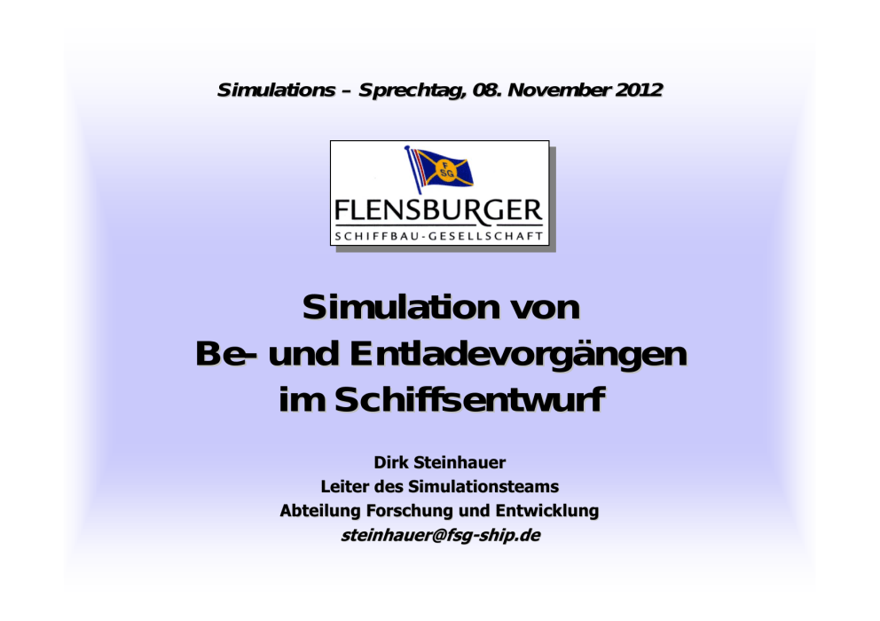 Simulations – Sprechtag, 08. November 2012 Simulation von Be- und Entladevorgängen im Schiffsentwurf Dirk Steinhauer Leiter des Simulationsteams Abteilung Forschung und Entwicklung [email protected] Anwendungen der Simulation in Produktion und Logistik bei der FSG Fabrikplanung Produktionsablauf Produktionsplanung planung und -steuerung Hafenlogistik Be- und Entladen von Schiffen Offshore-Windparks Bauwesen Synergien bei der Simulation mit Bausteinen auf der Basis von Plant Simulation (Siemens PLM) Anwendungen SimulationsBausteine Vorfertigung Stahl Schiffsmontage Transportsteuerung Logistik Portalkran Einrichtung Schichtregime Ausrüstung Struktur des STS (Simulation Toolkit Shipbuilding) inklusive der Add-on Bibliotheken - Load and discharge ships Transport Steel STS_ShipLog - Cutting machines - Welding machines - Assembly sites - Painting facilities - ... Basics Logistics - Storage control - Supplier - Packaging - ... - Floor conveying syst - Cranes - Roller conveyors - Streets / crossings - Transport control - Space - Model administration - Personnel control - Statistics - ... STS_PortLog Outfitting - Container terminals - RoRo terminals - Ferry terminals - Outfitting sites - Assembly control - ... Material - Steel parts - Steel elements - Outftting parts - ... Interior fitting - Compartment - ... STS_OWEA - Offshore windpark installation Beispielbausteine aus dem STS (Simulation Toolkit Shipbuilding) Kran Statistiken Transport Stahl - Profilaufsetzportal Schneidanlagen Schweißanlagen Montageplatz Beschichtung ... Logistik - Lagerve rwaltung Lieferan t Verpackung ... - Fläche Allgemein Material Fläche Modelladministration Personalsteuerung Statistiken ... - Stahlbaute ile - Ausrüstungsbauteile - ... Ausrüstung - Ausrüstungsplatz - Montagesteuerung - ... Bereich - Flurfördersystem - Kran - Rollengang - Straße/Kreuzung - Transportsteuerung Ausbau - Ausbaubereich - ... Montagesteuerung Bearbeitungsportal Transportsteuerung Die SIMoFIT Kooperation Simulation of Outfitting Processes in Shipbuilding and Civil Engineering Branchenübergreifende Zusammenarbeit Schiffbau – Bauwesen Basis ist der STS (Simulation Toolkit Shipbuilding). Constraint Based Simulation: Generische Definition von Abhängigkeiten www.simofit.com Einsatzgebiete der Materialflusssimulation bei der FSG Fertigungsplanung Werftentwicklung Layout- und Anlagenplanung strategisch taktisch operativ heute Logistik Schiff Hafen Zeit Zielsetzung der Simulation von Be- und Entladevorgängen im Schiffsentwurf Lösung eines Logistikproblems für den Kunden statt purem Entwurf eines Schiffes Schiff als Bestandteil eines kompletten Logistikkonzeptes Berücksichtigung der Randbedingungen des Kunden Ermittlung und Einbeziehung aller Einflussgrößen der Logistikkette in den Schiffsentwurf Problemstellungen bei der Be- und Entladung von RoRo-Schiffen Ladungsarten bei Schiffen mit RoRo-Anteil • Begleitete Transporte • Unbegleitete Transporte • Neuwagen Einflussgrößen bei der Be- und Entladung • Rampen • Hindernisse im Deck • Beladungsreihenfolgen • Wenderadien der Fahrzeuge • Anzahl der Zugmaschinen • ... Entwicklung der STS Add-on Bibliothek STS_ShipLog BeladungsSteuerung Geschwindigkeitsberechnung Verschiedene Wegearten • Deckweg • Rangierweg • Rampenweg • Rangierwegpaar Vorwärts/Rückwärts Datengenerierung FahrzeugQuelle FahrzeugSenke Verwaltung Deck X Deck 1 Landanbindung Trailerlager Verwaltung DeckSteuerung DeckSteuerung Rampe Verwaltung ... Deckbereiche Rampe Verwaltung ... Deckbereiche Anwendungsbeispiel Versorgungsschiff Beladung eines militärischen Versorgungsschiffes • • • • • Vielfältiges Fahrzeugspektrum (42 Fahrzeugtypen) Hoher Rangieraufwand während des Beladens Kontingent von Containern als Ladung Fahrzeuglift zum oberen Deck Fahrzeug-Anhänger-Gespanne Beladung eines militärischen Versorgungsschiffes Synergien bei der Simulation komplexer Be- und Entladevorgänge Bewertung komplexer Montageabläufe durch Constraint-basierte Simulation Generische Definition von Regel-Contraints Ergänzung spezifischer Constraints Management von Constraints durch STS tools Übertragung der Constraint-basierten Simulation auf Be- und Entladevorgänge Abhängigkeiten zwischen Decks, Decksbereichen und Rampen Limitierungen von Decksbereichen Einflüsse auf die Stabilität ... Anwendungsbeispiel RoRo-Schiff: : Simulation des Ent- und Beladevorgangs Simulation logistischer Abläufe im maritimen Umfeld Simulation von Logistikketten Simulation der Be- und Entladung Routen- und Flottensimulation Simulation der Hafenlogistik RoRo- und Fährterminals Containerterminals Simulation eines geplanten Fährterminals Simulation von Container-Terminals Simulation der Errichtung von Offshore-Windparks: Simulationsmodell in der 3D-Animation
