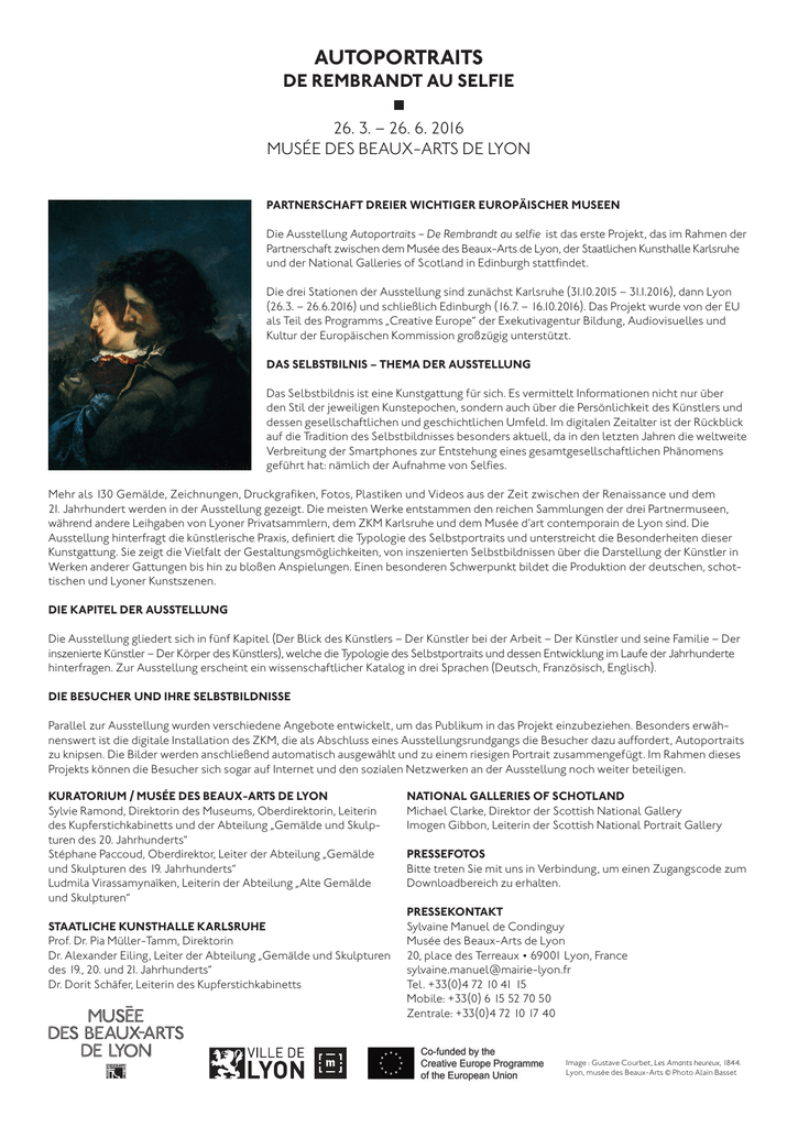 AUTOPORTRAITS DE REMBRANDT AU SELFIE 26. 3. – 26. 6. 2016 MUSÉE DES BEAUX-ARTS DE LYON PARTNERSCHAFT DREIER WICHTIGER EUROPÄISCHER MUSEEN Die Ausstellung Autoportraits – De Rembrandt au selfie ist das erste Projekt, das im Rahmen der Partnerschaft zwischen dem Musée des Beaux-Arts de Lyon, der Staatlichen Kunsthalle Karlsruhe und der National Galleries of Scotland in Edinburgh stattfindet. Die drei Stationen der Ausstellung sind zunächst Karlsruhe (31.10.2015 – 31.1.2016), dann Lyon (26.3. – 26.6.2016) und schließlich Edinburgh (16.7. – 16.10.2016). Das Projekt wurde von der EU als Teil des Programms „Creative Europe“ der Exekutivagentur Bildung, Audiovisuelles und Kultur der Europäischen Kommission großzügig unterstützt. DAS SELBSTBILNIS – THEMA DER AUSSTELLUNG Das Selbstbildnis ist eine Kunstgattung für sich. Es vermittelt Informationen nicht nur über den Stil der jeweiligen Kunstepochen, sondern auch über die Persönlichkeit des Künstlers und dessen gesellschaftlichen und geschichtlichen Umfeld. Im digitalen Zeitalter ist der Rückblick auf die Tradition des Selbstbildnisses besonders aktuell, da in den letzten Jahren die weltweite Verbreitung der Smartphones zur Entstehung eines gesamtgesellschaftlichen Phänomens geführt hat: nämlich der Aufnahme von Selfies. Mehr als 130 Gemälde, Zeichnungen, Druckgrafiken, Fotos, Plastiken und Videos aus der Zeit zwischen der Renaissance und dem 21. Jahrhundert werden in der Ausstellung gezeigt. Die meisten Werke entstammen den reichen Sammlungen der drei Partnermuseen, während andere Leihgaben von Lyoner Privatsammlern, dem ZKM Karlsruhe und dem Musée d’art contemporain de Lyon sind. Die Ausstellung hinterfragt die künstlerische Praxis, definiert die Typologie des Selbstportraits und unterstreicht die Besonderheiten dieser Kunstgattung. Sie zeigt die Vielfalt der Gestaltungsmöglichkeiten, von inszenierten Selbstbildnissen über die Darstellung der Künstler in Werken anderer Gattungen bis hin zu bloßen Anspielungen. Einen besonderen Schwerpunkt bildet die Produktion der deutschen, schottischen und Lyoner Kunstszenen. DIE KAPITEL DER AUSSTELLUNG Die Ausstellung gliedert sich in fünf Kapitel (Der Blick des Künstlers – Der Künstler bei der Arbeit – Der Künstler und seine Familie – Der inszenierte Künstler – Der Körper des Künstlers), welche die Typologie des Selbstportraits und dessen Entwicklung im Laufe der Jahrhunderte hinterfragen. Zur Ausstellung erscheint ein wissenschaftlicher Katalog in drei Sprachen (Deutsch, Französisch, Englisch). DIE BESUCHER UND IHRE SELBSTBILDNISSE Parallel zur Ausstellung wurden verschiedene Angebote entwickelt, um das Publikum in das Projekt einzubeziehen. Besonders erwähnenswert ist die digitale Installation des ZKM, die als Abschluss eines Ausstellungsrundgangs die Besucher dazu auffordert, Autoportraits zu knipsen. Die Bilder werden anschließend automatisch ausgewählt und zu einem riesigen Portrait zusammengefügt. Im Rahmen dieses Projekts können die Besucher sich sogar auf Internet und den sozialen Netzwerken an der Ausstellung noch weiter beteiligen. KURATORIUM / MUSÉE DES BEAUX-ARTS DE LYON Sylvie Ramond, Direktorin des Museums, Oberdirektorin, Leiterin des Kupferstichkabinetts und der Abteilung „Gemälde und Skulpturen des 20. Jahrhunderts“ Stéphane Paccoud, Oberdirektor, Leiter der Abteilung „Gemälde und Skulpturen des 19. Jahrhunderts“ Ludmila Virassamynaïken, Leiterin der Abteilung „Alte Gemälde und Skulpturen“ STAATLICHE KUNSTHALLE KARLSRUHE Prof. Dr. Pia Müller-Tamm, Direktorin Dr. Alexander Eiling, Leiter der Abteilung „Gemälde und Skulpturen des 19., 20. und 21. Jahrhunderts“ Dr. Dorit Schäfer, Leiterin des Kupferstichkabinetts NATIONAL GALLERIES OF SCHOTLAND Michael Clarke, Direktor der Scottish National Gallery Imogen Gibbon, Leiterin der Scottish National Portrait Gallery PRESSEFOTOS Bitte treten Sie mit uns in Verbindung, um einen Zugangscode zum Downloadbereich zu erhalten. PRESSEKONTAKT Sylvaine Manuel de Condinguy Musée des Beaux-Arts de Lyon 20, place des Terreaux • 69001 Lyon, France [email protected] Tel. +33(0)4 72 10 41 15 Mobile: +33(0) 6 15 52 70 50 Zentrale: +33(0)4 72 10 17 40 Image : Gustave Courbet, Les Amants heureux, 1844. Lyon, musée des Beaux-Arts © Photo Alain Basset