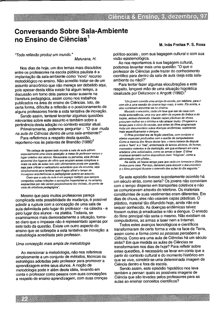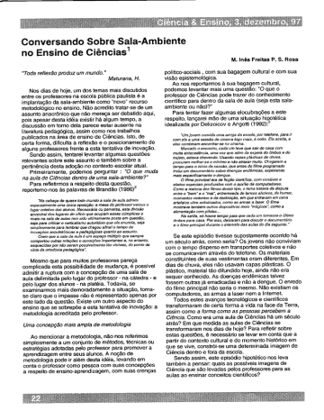 SobreSala-Ambiente Conversando no Ensinode Ciênciasl "Todareflexãoproduzum mundo." Maturana,H. Nos dias de hoje,um dos temasmaisdiscuüdos na escolapúblicapaulistaé a entreos professores "novo"recurso como implantação da sala-ambiente no ensino.Nãoacreditotratar-sede um metodológico assuntoanacrônicoque não mereçaser debatidoaqui, poisapesardestaidéiaexistirhá algumtempo,a discussãoem tornodelapareceesbr ausentena assimcomonostÍabalhos literaturapedagógica, oublicadosna áreade ensinode Ciências'lsto,de de certaforma,dificultaa reÍlexãoe o posicionamento frentea estatentaüvade inovação. algunsproÍessores Sendoassim,tenbrei levantaralgumasquestões relevantessobreesteassuntoe tambémsobrea atual. pertinência destaadoçãono contexb escolar "O que muda perguntar podemos : Primeiramente, na aulade Ciênciasdenúode umasala-ambiente?" a respeitodestaquesüio,^ Pararefleürmos palavras de Brandão(1986)' às reportemo-nos 'Na cabeçede quase todo mundo a sele de aula admìte espacialmenteuma únba oposiçâo:a mesa do proÍ-'ssor vgrsuso lugat coletivo dos alunos. Necessáia ou peNersa, esta divisáo ancesÍÍâl dos lugares de oíício que ocupam esses cÚmplicese Ìívâisna salade âulestem sido ultimamentêposìeem questáo, sejapara citica o vertícalismoautoitáio que ela enuncía,s4e sìmplesmenteperc lembnt que chegouafrnalo tempode inovaçõesarquitetònicase pedâgógicasquento ao assunto. Creío que a salade ^úle ó um espeço múltiploque sêmqe comfortou oulras rebções ê oposiçõesimpoftantese, no entanto, esquacidaspor náo sercm possivelmentetáo visíveís,do ponto dè visâ de oÌlodoxiapedagógice". pareça Mesmoque paramuitosproÍessores de mudança,é possível complicadaesta possibilidade admitira rupturacom a concepçãode umasalade auladelimibdapelolugardo proÍessor- na cátedra- e pelolugardos alunos- na platéia.Todavia,se a situação,tornamaisdemoradamente examinarmos apenaspor que reprêsentado o impassenãoé se claro questão. aspecto do um outro Exise esteladoda que inovação: a tentâüva de esb a se sobrepÕe ensino pelo professoÍ. acreditada metodologia IJmaconcepçãomais amplade metodologia não nos referimos Ao mencionara metodologia, a um conjuntode métodos,técnicasou simplesmente estratégiasadotadaspeloprofessoÍparapromovera entreseusalunos.A noçãode aprendizagem podeir alémdestaidéia,levandoem metodologia contao professorcomopessoacom suasconcepções com suascrenças a Íespeitcde ensino-aprendizagem, M. lnês FreitasP. S. Rosa político-sociais , com sua bagagemculturale comsua visãoepistemológica. à sua bagagemcultural, Ao nos reportarmos "O oodemoslevantarmaisumaquest?io: que o professorde Ciênciaspodekazerdo conhecimento cientíÍicoparadentroda salade aula (sejaestasalaambienteou nâo)?" a este ParatentarÍazeralgumaselocubraçoes respeito,lançareimãode umasituaçãohipptetica porDelizoicov e Angotti(1992):" idealizada 'lJm iovem convídauma amige de escola,pot teleÍone,pan ír com ele a umâ sessàode cínemelogo mais, à noite. Ela aceita, e elescombnemencontratse no cinema, Marcadoo encontro,cada um teve que seir cle casa com nuita ântecedêncie,umavez que além da esperc do ònibuse do taiêto, estâvachovendo.Usendocapasplásticas de chuve, pÍocufam molharse o mínimoe náo alrasü muíto.Chegenm e tempopaâ o início da sessáo,que entes do filne prcgnmado ìncluium documêntátbsobrc doençasendêmìcas,explorando mais especilicamenteo dengueO íilme Nincipal eê de frcçâocientífica,com cenáríose eíeitos especíaisproduzidoscom o âuxílio dê computadorcs. coÍto e naíoria dos Íilmesdesse tipo, o têma tatava dâ disputa ente o'bem' e o'mal', entrcmeadade lancesafetivos,de humor, momentosviolentosê de destruiçáo,êm que entavam em cene e leseL O frlme artelatos ulte-soíisticados, como as atmas'mágicos', como e mostravetambémoutros dispositivosneio alin entaçáocom pílulas... Ne saída, só houve tempopara que cada um tomesseo últímo ônibusparâ cese.Por isso,deixârcmPan díscutíto documentáio e o frlmeDincipel duíante o intevelo das aulas do die seguinte.' ocorridohá Se esteepisódiotivessesupostamente não conviviam seria? Os um séculoatrás,como iovens e não transportes coletivos em tempo disperso com o atravésdo teleÍone.Os materiais se comunicavam consütjintesde suasvestimenhseramdiferentes.Em dias de chuva,eles não usavamcapasplásticas.O plástico,materialtaiodifundidohoje,aindanãoera sequerconhecido.As doençasendêmicastalvez e não a dengue.O enredo Íossemoutrasjá erradicadas nãoseriao mesmo.Nãoexistiamos do Íilmeprincipal as armasa lasernema Internet. comoutadores, e cientíÍicos Todosestesavançostecnológicos na Íace da Tena, forma a vida certa transformaram de percebem pessoas a as a Íorma como assimcomo há um século de Ciências era uma aula Ciência.Como atrás?Em oue medidaas aulasde Ciênciasse nos diasde hoje?Pararefleürsobre transformaram é necessáriose levarem contaque a estasquestÕes, partirdo contextcculturale do momentohistóricoem que se vive,constÍói-seumadeterminadaimagemde Ciênciadentroe foÍa da escola, Sendoassim,esteepisódiohipotéticonos leva tambéma pensar:quaisas possíveisimagensde paraas Ciênciaque são levadaspelosprofessores conceitos científìcos? ensinar aulasao Reiteroaquia idéiaque a visãoepistemológica do proÍessorpodeeÍetivamente transformara percepção de sensocomumoue seusalunostêm da Ciência.A partirda sua mediação,váriasquestõespodemsurgir nas mentesdas criançase dos adolescentes que são seusarunos: 'E prcciso que se enÍatizeque o funcionanento da saleambientedependede uma oryânìzaçáodetenninadapelo professoL Estedevê ter clarezâ dos divercosmomentosdo trabalho,como : eules colêtiras, tnbehos em gnlpos è tnbalhos individuaís,que se tomâm rctinâ navida dos alunos, semdeìxálos pedidos ou disqêtsos'. ( p. 10f Queconcepçãode EducaçãoesÉ porÍás desta soliciEção?