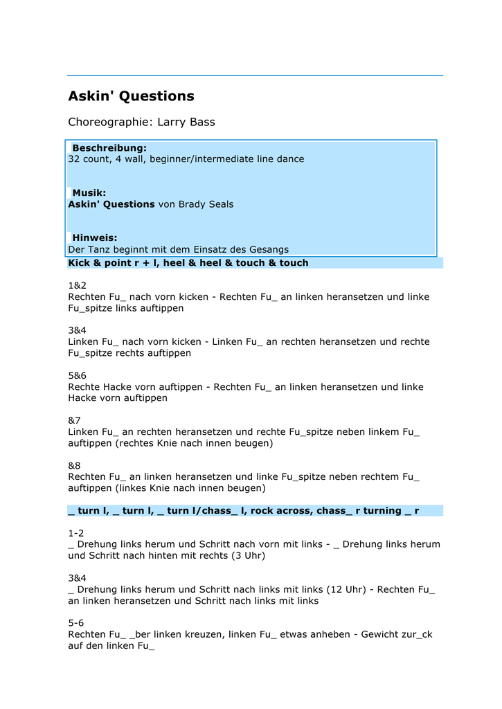 Askin' Questions Choreographie: Larry Bass Beschreibung: 32 count, 4 wall, beginner/intermediate line dance Musik: Askin' Questions von Brady Seals Hinweis: Der Tanz beginnt mit dem Einsatz des Gesangs Kick & point r + l, heel & heel & touch & touch 1&2 Rechten Fu_ nach vorn kicken - Rechten Fu_ an linken heransetzen und linke Fu_spitze links auftippen 3&4 Linken Fu_ nach vorn kicken - Linken Fu_ an rechten heransetzen und rechte Fu_spitze rechts auftippen 5&6 Rechte Hacke vorn auftippen - Rechten Fu_ an linken heransetzen und linke Hacke vorn auftippen &7 Linken Fu_ an rechten heransetzen und rechte Fu_spitze neben linkem Fu_ auftippen (rechtes Knie nach innen beugen) &8 Rechten Fu_ an linken heransetzen und linke Fu_spitze neben rechtem Fu_ auftippen (linkes Knie nach innen beugen) _ turn l, _ turn l, _ turn l/chass_ l, rock across, chass_ r turning _ r 1-2 _ Drehung links herum und Schritt nach vorn mit links - _ Drehung links herum und Schritt nach hinten mit rechts (3 Uhr) 3&4 _ Drehung links herum und Schritt nach links mit links (12 Uhr) - Rechten Fu_ an linken heransetzen und Schritt nach links mit links 5-6 Rechten Fu_ _ber linken kreuzen, linken Fu_ etwas anheben - Gewicht zur_ck auf den linken Fu_ 7&8 Schritt nach rechts mit rechts - Linken Fu_ an rechten heransetzen, _ Drehung rechts herum und Schritt nach vorn mit rechts (3 Uhr) Step, pivot _ r, chass_ l, sailor step, behind-side-cross 1-2 Schritt nach vorn mit links - _ Drehung rechts herum auf beiden Ballen, Gewicht am Ende rechts (12 Uhr) 3&4 Schritt nach links mit links - Rechten Fu_ an linken heransetzen und Schritt nach links mit links 5&6 Rechten Fu_ hinter linken kreuzen - Schritt nach links mit links und Schritt etwas nach schr_g rechts vorn mit rechts 7&8 Linken Fu_ hinter rechten kreuzen - Schritt nach rechts mit rechts und linken Fu_ _ber rechten kreuzen Side, pivot _ l, shuffle forward turning _ l, rock back, shuffle forward 1-2 Schritt nach rechts mit rechts - _ Drehung links herum auf beiden Ballen, Gewicht am Ende links (9 Uhr) 3&4 _ Drehung links herum und Schritt nach rechts mit rechts - Linken Fu_ an rechten heransetzen, _ Drehung links herum und Schritt nach hinten mit rechts (3 Uhr) 5-6 Schritt nach hinten mit links, rechten Fu_ etwas anheben - Gewicht zur_ck auf den rechten Fu_ 7&8 Schritt nach vorn mit links - Rechten Fu_ an linken heransetzen und Schritt nach vorn mit links Wiederholung bis zum Ende Larry Bass Adresse: P.O. Box 6622, Jacksonville, FL 32236; Telefon: (904) 737-2144 Links: [eMail] [Homepage] Brady Seals Askin' Questions Album: Unbekannt