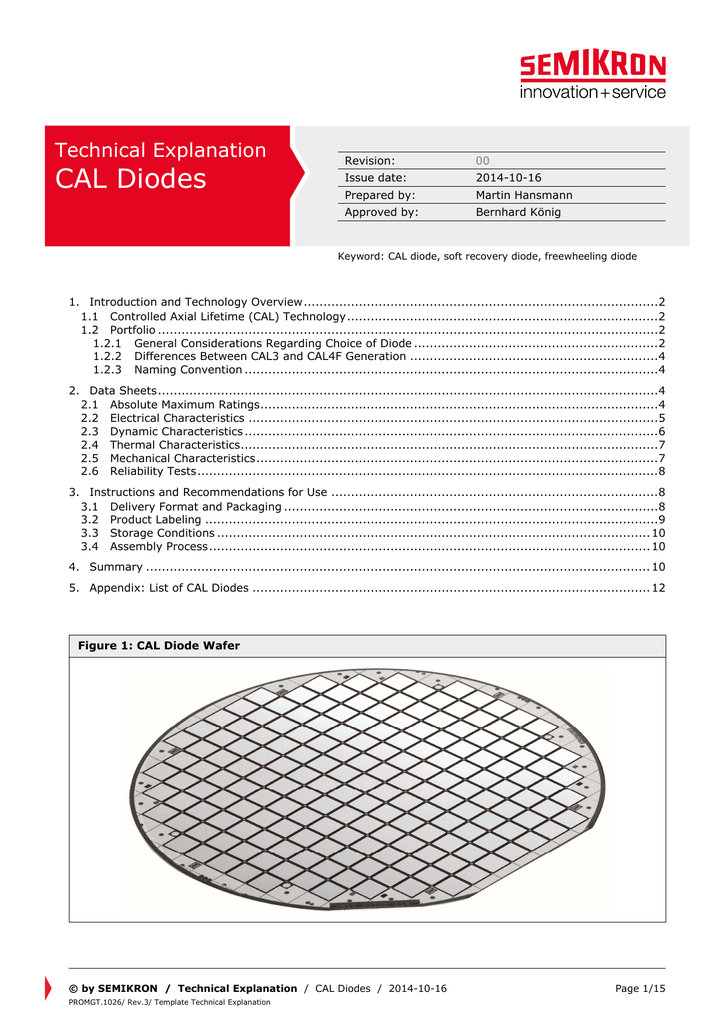 Technical Explanation CAL Diodes Revision: 00 Issue date: 2014-10-16 Prepared by: Martin Hansmann Approved by: Bernhard König Keyword: CAL diode, soft recovery diode, freewheeling diode 1. Introduction and Technology Overview ..........................................................................................2 1.1 Controlled Axial Lifetime (CAL) Technology ...............................................................................2 1.2 Portfolio ...............................................................................................................................2 1.2.1 General Considerations Regarding Choice of Diode ..............................................................2 1.2.2 Differences Between CAL3 and CAL4F Generation ...............................................................4 1.2.3 Naming Convention .........................................................................................................4 2. Data Sheets ...............................................................................................................................4 2.1 Absolute Maximum Ratings.....................................................................................................4 2.2 Electrical Characteristics ........................................................................................................5 2.3 Dynamic Characteristics .........................................................................................................6 2.4 Thermal Characteristics..........................................................................................................7 2.5 Mechanical Characteristics ......................................................................................................7 2.6 Reliability Tests .....................................................................................................................8 3. Instructions and Recommendations for Use ...................................................................................8 3.1 Delivery Format and Packaging ...............................................................................................8 3.2 Product Labeling ...................................................................................................................9 3.3 Storage Conditions .............................................................................................................. 10 3.4 Assembly Process ................................................................................................................ 10 4. Summary ................................................................................................................................ 10 5. Appendix: List of CAL Diodes ..................................................................................................... 12 Figure 1: CAL Diode Wafer © by SEMIKRON / Technical Explanation / CAL Diodes / 2014-10-16 PROMGT.1026/ Rev.3/ Template Technical Explanation Page 1/15 1. Introduction and Technology Overview CAL diodes represent a family of soft and fast recovery diodes used in conjunction with an Insulating Gate Bipolar Transistor (IGBT). There exists two major generations, CAL3/HD (suitable for Tjmax=150°C) as well as CAL4F with a state-of-the-art performance up to Tjmax=175°C. CAL diodes are available in different voltage classes from 600 V up to 1700 V, and current ratings from 6 A to 200 A. The diodes are primarily developed for use in power modules but could also be packaged as discrete devices. 1.1 Controlled Axial Lifetime (CAL) Technology A freewheeling diode for an IGBT must exhibit a soft recovery behavior during switch-off of the diode in order to avoid high overvoltages caused by stray inductances and a high rate of fall of the diode current di/dt. Overvoltages could lead to damage or destruction of semiconductor devices in the circuitry. The softness and low reverse recovery charge of the CAL diode is achieved by locally influencing the carrier lifetime along the current path between anode and cathode (i.e. the z axis) [2], intentionally lowering it at the p-n junction (cf. Figure 2). This non-uniform behavior is reflected in the naming of the diode: Controlled Axial Lifetime or CAL. CAL technology has been introduced by SEMIKRON in 1992 and further optimized ever since. It is still one of the softest and best performing diodes on the market, especially in its latest CAL4F generation. Besides the soft recovery, CAL diodes are characterized by a high dynamic robustness. Most CAL families exhibit an only slightly negative or even positive temperature coefficient above the nominal current (cf. section 2.2). This property is beneficial in case of parallel operation of diodes which is common in power module layouts. Figure 2: CAL Diode Principle (Schematic) 1.2 1.2.1 Portfolio General Considerations Regarding Choice of Diode In order to achieve the optimum performance of a freewheeling diode, it is important to use it with a fitting IGBT. SEMIKRON freewheeling diodes have been developed and used with a large range of IGBTs by different vendors. The fitness for use can be checked initially by comparing some basic parameters: voltage class, junction temperature and nominal current. An overview of the currently available choices are given in Table 1. A complete list of currently available die sizes is given in the appendix in section 5. © by SEMIKRON / Technical Explanation / CAL Diodes / 2014-10-16 Page 2/15 Table 1: CAL Diodes Portfolio Overview (status Q3/2014) Voltage Class Available Tjmax IFnom Chip Area 600 V 150°C and 175°C 10 … 210 A 4 … 121 mm2 650 V 175°C 50 … 200 A 24 … 81 mm2 1200 V 150°C and 175°C 6 … 160 A 6 … 121 mm2 1700 V 150°C and 175°C 55 … 150 A 47 … 81 mm2 One of these basic parameters is the voltage class describing the maximum repetitive reverse voltage (Vrrm) which can be applied to the diode at room temperature. It should be chosen acco