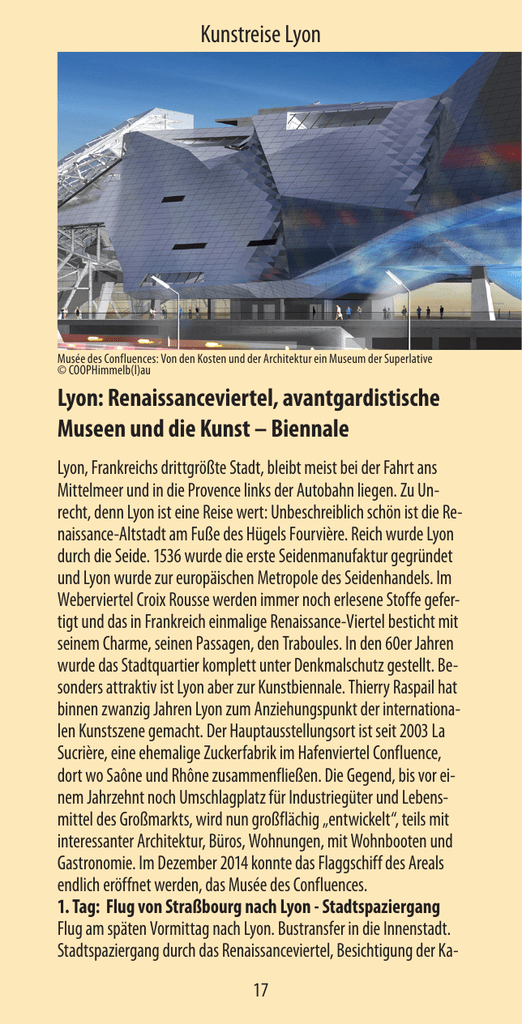 Kunstreise Lyon Musée des Confluences: Von den Kosten und der Architektur ein Museum der Superlative © COOPHimmelb(l)au Lyon: Renaissanceviertel, avantgardistische Museen und die Kunst – Biennale Lyon, Frankreichs drittgrößte Stadt, bleibt meist bei der Fahrt ans Mittelmeer und in die Provence links der Autobahn liegen. Zu Unrecht, denn Lyon ist eine Reise wert: Unbeschreiblich schön ist die Renaissance-Altstadt am Fuße des Hügels Fourvière. Reich wurde Lyon durch die Seide. 1536 wurde die erste Seidenmanufaktur gegründet und Lyon wurde zur europäischen Metropole des Seidenhandels. Im Weberviertel Croix Rousse werden immer noch erlesene Stoffe gefertigt und das in Frankreich einmalige Renaissance-Viertel besticht mit seinem Charme, seinen Passagen, den Traboules. In den 60er Jahren wurde das Stadtquartier komplett unter Denkmalschutz gestellt. Besonders attraktiv ist Lyon aber zur Kunstbiennale. Thierry Raspail hat binnen zwanzig Jahren Lyon zum Anziehungspunkt der internationalen Kunstszene gemacht. Der Hauptausstellungsort ist seit 2003 La Sucrière, eine ehemalige Zuckerfabrik im Hafenviertel Confluence, dort wo Saône und Rhône zusammenfließen. Die Gegend, bis vor einem Jahrzehnt noch Umschlagplatz für Industriegüter und Lebensmittel des Großmarkts, wird nun großflächig „entwickelt“, teils mit interessanter Architektur, Büros, Wohnungen, mit Wohnbooten und Gastronomie. Im Dezember 2014 konnte das Flaggschiff des Areals endlich eröffnet werden, das Musée des Confluences. 1. Tag: Flug von Straßbourg nach Lyon - Stadtspaziergang Flug am späten Vormittag nach Lyon. Bustransfer in die Innenstadt. Stadtspaziergang durch das Renaissanceviertel, Besichtigung der Ka17 thedrale St. Jean und Fahrt mit der Zahnradbahn zur Basilika NotreDame de Fourvière. Abends Möglichkeit zum gemeinsamen Essen in einem traditionellen Lyoner Bouchon. 2. Tag: Bootsfahrt -La Sucrère - Musée des Confluences Bootsfahrt in das Quartier Confluence am Zusammenfluss von Rhône und Saône. Besuch von La Sucrère, einer ehemaligen Zuckerfabrik im Hafenviertel Confluence. Nachmittags Besichtigung des Musée des Confluences. 3. Tag: Musée d`Art Contemporain - Musée des Beaux Arts Mit dem Shuttleboot auf der Rhône gelangen Sie zum zweiten Hauptausstellungsort der Biennale: zum von Renzo Piano erweiterten Musée d‘Art Contemporain, kurz MAC. Am Nachmittag besichtigen Sie das Musée des Beaux Arts. Nach dem Louvre ist es das bedeutendste Museum in Frankreich. Der Flug startet um Abend in Lyon. Geringe Änderungen im Programmablauf vorbehalten Leistungen: l Reiseleitung durch Werner Meyer M.A. l Flug Straßb.-Lyon-Straßb. l Zubringerdienst FR - Straßburg - FR l Eintritt & Führungen l Bustransfer bzw. Bootsfahrt in Lyon lt. Programm l 2 x ÜF im ****Hotel Mercure Plaza République, Lyon Veranstalter: Spillmann Reisen, Bietigheim-Bissingen 795,- € Fr. 02. - So. 04.10.2015 Preis / Person im DZ: 18 EZ-Zuschlag: 200,-