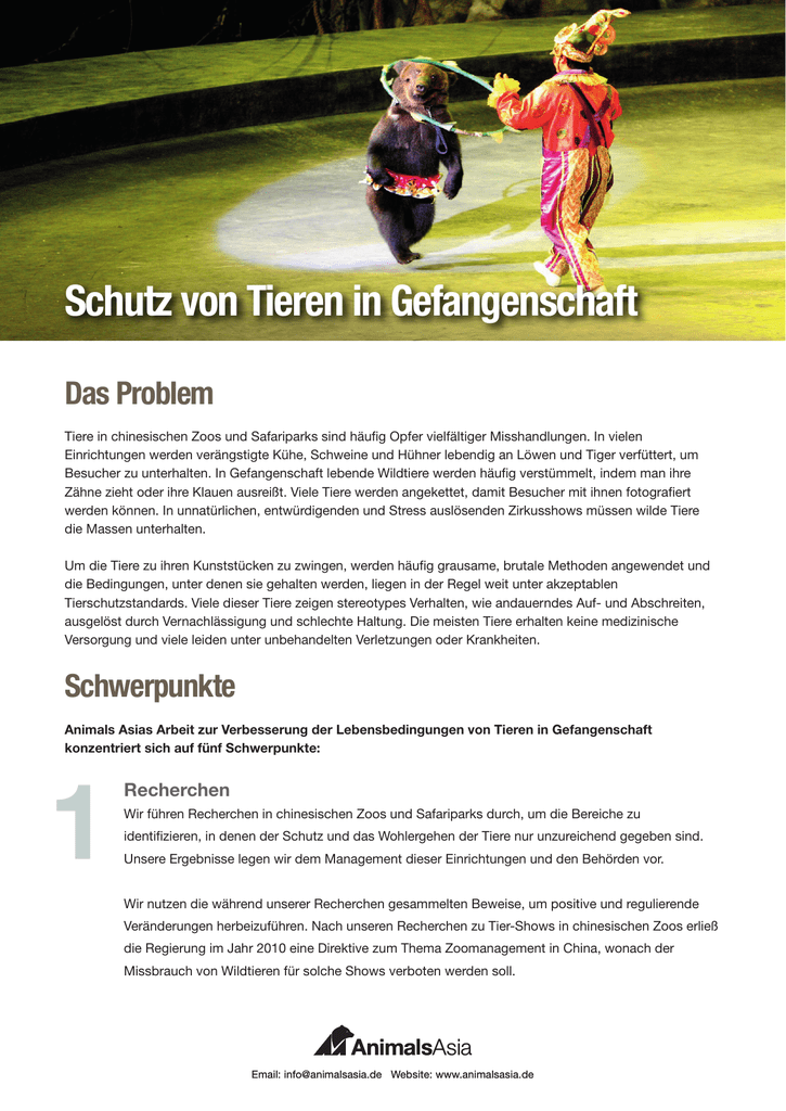 Schutz von Tieren in Gefangenschaft Das Problem Tiere in chinesischen Zoos und Safariparks sind häufig Opfer vielfältiger Misshandlungen. In vielen Einrichtungen werden verängstigte Kühe, Schweine und Hühner lebendig an Löwen und Tiger verfüttert, um Besucher zu unterhalten. In Gefangenschaft lebende Wildtiere werden häufig verstümmelt, indem man ihre Zähne zieht oder ihre Klauen ausreißt. Viele Tiere werden angekettet, damit Besucher mit ihnen fotografiert werden können. In unnatürlichen, entwürdigenden und Stress auslösenden Zirkusshows müssen wilde Tiere die Massen unterhalten. Um die Tiere zu ihren Kunststücken zu zwingen, werden häufig grausame, brutale Methoden angewendet und die Bedingungen, unter denen sie gehalten werden, liegen in der Regel weit unter akzeptablen Tierschutzstandards. Viele dieser Tiere zeigen stereotypes Verhalten, wie andauerndes Auf- und Abschreiten, ausgelöst durch Vernachlässigung und schlechte Haltung. Die meisten Tiere erhalten keine medizinische Versorgung und viele leiden unter unbehandelten Verletzungen oder Krankheiten. Schwerpunkte Animals Asias Arbeit zur Verbesserung der Lebensbedingungen von Tieren in Gefangenschaft konzentriert sich auf fünf Schwerpunkte: 1 Recherchen Wir führen Recherchen in chinesischen Zoos und Safariparks durch, um die Bereiche zu identifizieren, in denen der Schutz und das Wohlergehen der Tiere nur unzureichend gegeben sind. Unsere Ergebnisse legen wir dem Management dieser Einrichtungen und den Behörden vor. Wir nutzen die während unserer Recherchen gesammelten Beweise, um positive und regulierende Veränderungen herbeizuführen. Nach unseren Recherchen zu Tier-Shows in chinesischen Zoos erließ die Regierung im Jahr 2010 eine Direktive zum Thema Zoomanagement in China, wonach der Missbrauch von Wildtieren für solche Shows verboten werden soll. Email: [email protected] Website: www.animalsasia.de Wir appellieren an Zooverantwortliche, das Thema Tierschutz für ihre Einrichtungen ernst zu nehmen. Außerdem arbeiten wir eng mit der chinesischen Behörde zusammen, die für die zoologischen Gärten verantwortlich ist. 2 Verbesserung der Lebensbedingungen Wir bieten Weiterbildungen für Angestellte chinesischer Zoos und Safariparks an, um ihnen die Bedürfnisse von Tieren in Gefangenschaft zu vermitteln. Wir kämpfen für Veränderungen in der Haltung von Tieren, die in öffentlichen chinesischen Einrichtungen leben. Wir zeigen Beschäftigungsprogramme und Möglichkeiten auf, Tiere in Gefangenschaft zu stimulieren, natürliche Verhaltensweisen zu fördern und stereotypes Verhalten zu vermeiden. In praxisorientierten Workshops vermitteln wir, wie man mit einfachen Mitteln Spielzeug und Beschäftigungsgeräte für Außengehege herstellen kann und wie man durch das Abwechseln verschiedener Beschäftigungsprogramme die Lebensbedingungen der Tiere deutlich verbessern kann. 3 Ausbildung von Tierärzten Wir bieten Workshops für Tierärzte chinesischer Zoos an, um ihre Fertigkeiten zu verbessern und ihnen die neuesten Tierschutzkonzepte und spezielle medizinische Techniken zu vermitteln. Für diese Workshops arbeiten wir zusammen mit dem „Jeanne Marchig International Centre for Animal Welfare Education“ (Fachbereich „Royal [Dick] School of Veterinary Studies“ an der „University of Edinburgh“) und der chinesischen Behörde, die für die zoologischen Gärten verantwortlich ist. In praxisorientierten Workshops lernen die Teilnehmer, wie beim Patienten eine positive und möglichst stressfreie Behandlung durchgeführt werden kann. Für die Schulungen werden natürlich keine lebenden Tiere, sondern Attrappen eingesetzt. Den Teilnehmern wird dadurch gleichzeitig demonstriert, dass Tierversuche für diese Arten von Schulungen völlig überflüssig sind. Öffentliches Bewusstsein Email: [email protected] Website: www.animalsasia.de 4 Wir halten Präsentationen in Schulen und Universitäten. Wir vermitteln, dass Tiere ebenso empfindungsfähig sind wie wir und klären über Tierschutzanliegen auf. Auf diese Weise versuchen wir, Mitgefühl zu erzeugen und ein kritisches Bewusstsein für die Praktiken in Zoos und Safariparks zu schaffen, die so viel Leid verursachen. Wir glauben, dass Wissen der Schlüssel für nachhaltige Veränderung ist. Deshalb vermitteln unsere Tierschutzbeauftragten Schülern und Studenten aller Altersstufen die Botschaft, dass alle Tiere genauso empfindungsfähig sind wie wir und dass es falsch ist, sie für unsere Unterhaltung zu missbrauchen. 5 Regierung und Politik Wir verhandeln mit Behörden, Vertretern der Öffentlichkeit und Politikern in ganz China, um Tiere in chinesischen Zoos und Safariparks vor Vernachlässigung und Missbrauch zu schützen. Wir stehen Behörden zum Thema Tierschutz beratend zur Seite. Dazu gehört die Behörde, die für die zoologischen Gärten verantwortlich ist, und die chinesische Tierschutzbehörde. Gemeinsam erarbeiten wir beispielsweise Schulungsmaterial für Tierpfleger. Durch diese Zusammenarbeit entstehen Präsentationen und Workshops zur Fortbildung von Tier-Managern und Tierärzten, die in chinesischen Einrichtungen tätig sind. Aus dieser positiven Zusammenarbeit sind eine Reihe Initiativen entstanden, die es Zooeinrichtungen auf der ganzen Welt ermöglichen, sich auszutauschen und voneinander zu lernen. Email: [email protected] Website: www.animalsasia.de