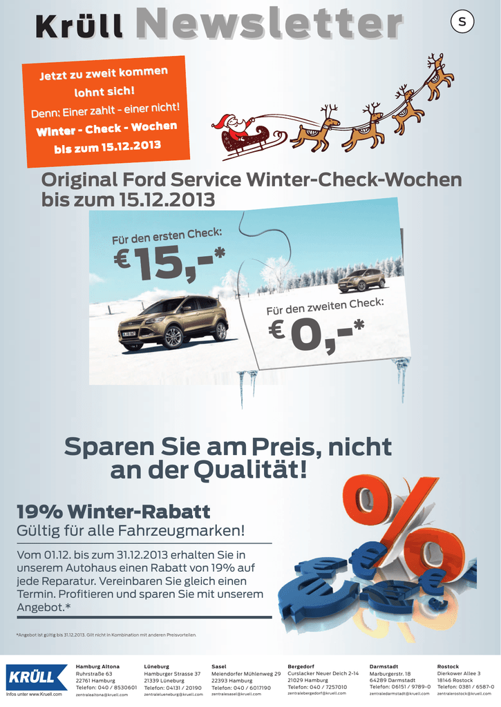 Krüll Newsletter s m en Je tz t zu zwei t ko m lo hn t si ch ! ner nicht! Denn: Einer zahlt - ei oc he n Win te r - C he ck - W bi s zu m 15 .1 2. 20 13 Original Ford Service Winter-Check-Wochen bis zum 15.12.2013 n Check: Für den erste € 15,- * iten Check: Für den zwe € 0,- * Sparen Sie am Preis, nicht an der Qualität! 19% Winter-Rabatt Gültig für alle Fahrzeugmarken! Vom 01.12. bis zum 31.12.2013 erhalten Sie in unserem Autohaus einen Rabatt von 19% auf jede Reparatur. Vereinbaren Sie gleich einen Termin. Profitieren und sparen Sie mit unserem Angebot.* Infos unter www.Kruell.com 21339 Lüneburg Telefon: 04131 / 20190 Sasel Meiendorfer Mühlenweg 29 22393 Hamburg Telefon: 040 / 6017190 Bergedorf Curslacker Neuer Deich 2-14 21029 Hamburg Telefon: 040 / 7257010 Darmstadt Marburgerstr. 18 64289 Darmstadt Telefon: 06151 / 9789-0 Rostock Dierkower Allee 3 18146 Rostock Telefon: 0381 / 6587-0 [email protected] [email protected] [email protected] [email protected] [email protected] Hamburg Altona Ruhrstraße 63 22761 Hamburg Telefon: 040 / 8530601 Lüneburg Hamburger Strasse 37 [email protected]