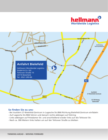 FriedrichHagemann-Str. Os t ring Bechterdisser Str. Lud tr. ger dis ser str. trin g Os Stieghors Hellmann Worldwide Logistics GmbH & Co. KG Teltower Straße 15 33719 Bielefeld Tel.: 0521 293-00 Din e ter Straß rS Anfahrt Bielefeld me da Po ts wig -Er Bun r. r St ue zla har d-A llee er Str. Ostri Oldentrup A2 Richtung Bad Oeyenhausen ng Hillegosser Str. Grasbreede Oldentruper Str. A2 olde r Str . Detm B66 Lage sche Str. Ausfahrt 27-Bielefeld-Zentrum A2 Richtung Gütersloh So finden Sie zu uns: - Bei Ausfahrt 27-Bielefeld-Zentrum in Lagesche Str./B66 Richtung Bielefeld-Zentrum einfädeln - Auf Lagesche Str./B66 fahren und danach rechts abbiegen auf Ostring - Links abbiegen auf Potsdamer Str. und anschließend wieder links auf die Teltower Str. - Nach ca. 300 Metern links halten um auf der Teltower Straße zu bleiben THINKING AHEAD – MOVING FORWARD