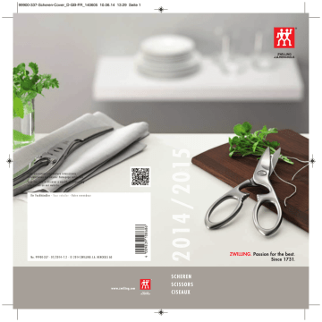 99900-337-Scheren-Cover_D-GB-FR_140605 10.06.14 13:29 Seite 1 Code einscannen und weitere interessante Informationen auf unserer Homepage entdecken. Scan the code to discover a wealth of interesting information on our website. No. 99900-337 · 07/2014–7.2 · © 2014 ZWILLING J.A. HENCKELS AG ÆxAKJINTy108686z I h r Fa c h h ä n d l e r · Yo ur re ta ile r · Votre reve n deur SCHEREN SCISSORS CISEAUX 99900-337-Scheren-Cover_D-GB-FR_140605 10.06.14 13:29 Seite 2 ZWILLING Online INHALTSVERZEICHNIS CONTENTS CONTENU ZWILLING. PASSION FOR THE BEST. 4 LEIDENSCHAFT FÜR QUALITÄT · PASSION FOR QUALIT Y PASSION POUR L A QUALITÉ 6 TIPPS FÜR DIE PFLEGE · CARE TIPS · CONSEIL D’ENTRETIEN 8 T WIN ® Select 10 Original KÜCHENHILFE 14 T WIN ® M 20 Unser komplettes Sortiment Our complete catalogue finden Sie auch unter: is also online: www.zwilling.com Original T WIN ® 24 SUPERFECTION Classic 30 T WIN ® L 36 2 www.zwilling.com Notre catalogue complet est également en ligne: www.zwilling.com 49 INHALTSVERZEICHNIS CONTENTS CONTENU GEFLÜGELSCHEREN POULTRY SHEARS CISEAUX À VOLAILLES 42 AUSGEZEICHNETES DESIGN · EXCEPTIONAL DESIGN · DESIGN EXCEPTIONEL 46 3 ZWILLING. PASSION FOR THE BEST. ÜBER ZWILLING SCHEREN LÄSST SICH EINE MENGE SAGEN: ZUR LANGEN TRADITION ECHTER ZWILLING QUALITÄT, DIE BIS IN DAS JAHR 1731 ZURÜCKREICHT. THERE IS A LOT TO BE SAID ABOUT ZWILLING J.A. HENCKELS SCISSORS: THE LONG TRADITION OF ZWILLING J.A. HENCKELS WHICH DATES BACK TO 1731. Zu den hohen Anforde rungen, die wir an jedes unserer Produkte stellen: Zum Beispiel, dass sich eine Schere extrem leicht und präzise öffnen sowie schließen lässt und bei sachgerechter Handhabung dauerhaft scharf bleibt. Nur eines kann man nicht in Worte fassen, das kann jeder nur selbst entdecken: ZWILLING. Passion for the best. The high demands we place upon each of our products: a pair of scissors for example, needs to have a precise and extremely easy closing action and has to stay sharp for a long time when properly cared for. There is only one thing we cannot express in words. It needs to be experienced: ZWILLING. Passion for the best. SCHNEIDEN, ZERTEILEN, KÜRZEN, ZERKLEINERN – IMMER MEHR MENSCHEN ENTDECKEN DIE VIELFALT VON ZWILLING SCHEREN. CUTTING, SHORTENING, DIVIDING – MORE AND MORE PEOPLE DISCOVER THE DIVERSITY OF ZWILLING J.A. HENCKELS SCISSORS. Da gibt es für jede Gelegenheit das optimale Werkzeug: für alle täglichen Jobs in der Küche die robusten Vielzweckscheren, für feinere Arbeiten die kleineren Haushalts scheren und zum Tranchieren von Pute oder Ente die Geflügelscheren. Auch wenn man immer geglaubt hat, mit nur einer Schere im Haushalt gut zurecht zu kommen, wird man schnell merken, wie praktisch es ist, Spezialscheren von ZWILLING zu besitzen. Nämlich dann, wenn unliebsame Haushalts arbeiten zum Ver gnügen werden. There is always the right pair for each occasion: the versatile and robust multipurpose shears for the daily kitchen routine, finer work needs smaller household scissors and for cutting up turkeys or ducks poultry shears are ideal. If up to now you thought that one pair of scissors will just be enough, you will soon discover the advantage of owning more than one of the specialist scissors and shears by ZWILLING J.A. HENCKELS. 4 LEIDENSCHAFT FÜR QUALITÄT PASSION FOR QUALITY PASSION POUR LA QUALITÉ 1969 IL Y A BEAUCOUP À DIRE SUR LES CISEAUX ZWILLING J.A. HENCKELS: SUR LA LONGUE TRADITION DE LA VÉRITABLE QUALITÉ ZWILLING J.A. HENCKELS QUI PERDURE DEPUIS L’AN 1731. Sur les critères très stricts à remplir par chacun de nos produits: par exemple l’extrême facilité et précision avec laquelle une paire de ciseaux se laisse ouvrir et refermer, la durabilité de son tranchant, moyennant usage conforme. Il n’y a qu’une seule chose indicible, que chacun peut découvrir par lui-même: ZWILLING. Passion for the best. 1900 1875 1850 QU’IL S’AGISSE DE COUPER, DÉPECER, RACCOURCIR OU RÉDUIRE EN MORCEAUX, LA POLYVALENCE DES CISEAUX ZWILLING J.A. HENCKELS SÉDUIT DE PLUS EN PLUS DE PERSONNES. Vous trouverez l’outil idéal pour chaque occasion. Des ciseaux solides à usages multiples pour toutes les tâches quotidiennes en cuisine, des petits ciseaux de ménage pour les travaux plus fins et des coupe-volailles pour découper les dindes et autres canards. Même si vous avez toujours cru pouvoir vous débrouiller avec une seule paire de ciseaux dans le ménage, vous remarquerez vite combien il est pratique de posséder des ciseaux spéciaux ZWILLING J.A. HENCKELS. C’est normal: la réalisation de travaux ménagers jusque là désagréables devient tout à coup un plaisir. 1810 1731 5 99900-337-Scheren_D-GB-FR_Faltseite_140605 11.06.14 12:25 Seite 7 DIE SCHERE UND IHRE BESTANDTEILE THE SCISSOR AND ITS COMPONENTS LE CISEAU ET SES COMPOSANTS TIPPS FÜR DIE PFLEGE CARE TIPS CONSEIL D’ENTRETIEN Spitze Point Pointe Wate Cutting edge Tranchant Blatt Blade Lame Rücken Back Dos Zwischen Between Intervalle Hohle Inner side Coté intérieur Schraube Score Trait Gewerbe Joint area Aire du joint Halm Handle Poignée Auge Eye ring Anneau de l’œil 7 Wer seine Schere pflegt, wird lange Zeit Freude an ihr haben. Dagegen ruinieren falscher Einsatz und falsche Handhabung jede Schere. Scissors that have been properly taken care of can be enjoyed for a long time. But incorrect use and handling will ruin them. SICHER AUFBEWAHREN KEEPING SAFE Staub, Flusen und Schneidrückstände von den Schneidkanten und Scherenblättern wischen und die Schere an einem trockenen Platz aufbewahren. Das gilt besonders für vernickelte Scheren aus Kohlenstoffstahl, denn sie können an feuchter Luft an den nicht oberflächengeschützten Stellen rosten. Dust, fluff and the remains of cutting material should be wiped off the cutting edges and blades. The scissors should be stored in a dry place. This applies particularly to nickel-plated, carbon-steel scissors and shears because the unprotected areas of the surface ar