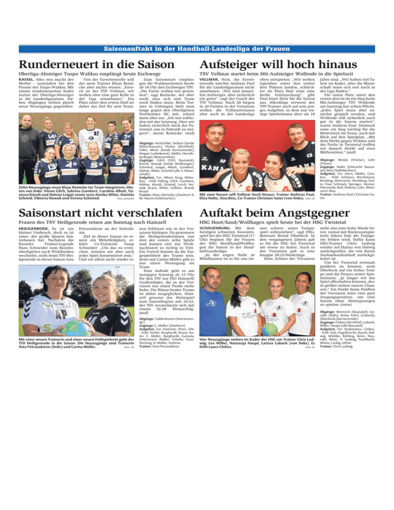Saisonauftakt in der Handball-Landesliga der Frauen Runderneuert in die Saison Aufsteiger will hoch hinaus Oberliga-Absteiger Tuspo Waldau empfängt heute Eschwege TSV Vellmar startet beim Mit-Aufsteiger Wollrode in die Spielzeit KASSEL. Alles neu macht der Herbst - zumindest bei den Fraune des Tuspo Waldau. Mit einem runderneuerten Kader startet der Oberliga-Absteiger in die Landesligasaison. Sieben Abgängen stehen gleich neun Neuzugänge gegenüber. VELLMAR. Nein, die Favoritenrolle möchte Andreas Paul für die Landesligasaison nicht annehmen. „Wir sind immerhin Aufsteiger, aber sicherlich ein guter“, sagt der Coach des TSV Vellmar. Nach 20 Siegen in 20 Partien in der Vorsaison wollen die Vellmarerinnen aber auch in der Landesliga Von der Favoritenrolle will der neue Trainer Klaus Reinicke aber nichts wissen: „Favorit ist der TSV Vellmar, wir wollen aber eine gute Rolle in der Liga einnehmen.“ Ein Platz unter den ersten fünf sei daher das Ziel für sein Team. Zehn Neuzugänge muss Klaus Reinicke ins Team integrieren. Hinten von links: Vivian Gilch, Sabrina Gombert, Caroline Alheit, Vanessa Künzli und Helene Leippi sowie vorn Annika Witte, Daniela Schmid, Viktoria Nowak und Verena Schmied. Foto: privat/nh Zum Saisonstart empfangen die Waldauerinnen heute ab 18 Uhr den Eschweger TSV. „Die Partie wollen wir gewinnen“, sagt Reinicke, der aber weiß, dass sich sein Team noch finden muss. Beim Turnier in Göttingen hielt man lange gegen den Oberligisten Northeimer HC mit, schied dann aber aus. „Ich war zufrieden mit der Leistung. Aber wir haben sicherlich noch das Potenzial, uns in Zukunft zu steigern“, meint Reinicke. (msf) Abgänge: Hentschke, Siebert (beide Dittershausen), Hintze (Kirchhof), Faller, Meier (beide Karriereende), Hoppe (unbekannt), Müller (berufsbedingte Abwesenheit) Zugänge: Gilch (HSG Baunatal), Künzli, Nowak (beide Wolfsanger), Schmied, Leippi, Alheit, Gombert, Höhne, Witte, Schmid (alle 2. Mannschaft). Aufgebot, Tor: Alheit, Krug, WitteRau. - Feld: Fölling, Gilch, Gombert, Höhne, Künzli, Schmid, Lerch, Nowak, Kranz, Witte, Geßner, Brand, Knauf. Trainer: Klaus Reinicke (Zwehren II, für Martin Geldmacher) oben mitspielen. „Wir wollen irgendwo unter den ersten drei Plätzen landen, schlechter als Platz fünf wäre eine herbe Enttäuschung“, gibt Paul klare Ziele für die Saison aus. Allerdings verweist der TSV-Trainer auch auf sein junges Aufgebot, in dem nur wenige Spielerinnen älter als 18 Mit zwei Neuen will Vellmar hoch hinaus: Trainer Andreas Paul, Elisa Nolte, Sina Binz, Co-Trainer Christian Sutor (von links). Foto: nh Jahre sind. „Wir haben viel Talent im Kader, aber die Mannschaft muss sich erst noch in der Liga finden.“ Für einen Platz unter den ersten drei ist da ein Sieg beim Mit-Aufsteiger TSV Wollrode am Samstag fast schon Pflicht. „Jedes Spiel muss aber zunächst gespielt werden, und Wollrode will sicherlich auch gut in die Saison starten“, warnt Andreas Paul. Dennoch wäre ein Sieg wichtig für die Motivation im Team, auch mit Blick auf den Spielplan. „Mit dem Derby gegen Waldau und der Partie in Twistetal treffen wir danach direkt auf zwei Mitfavoriten.“ (msf) Abgänge: Weida (Fritzlar), Lohr (Pause) Zugänge: Nolte (Eintracht Baunatal), Binz (Vollnkirchen) Aufgebot, Tor: Stern, Müller, Geislers. - Feld: Schwarz, Brückmann, Breiding, Weinreich, Homburg, Nolte, Paul, Schmalz, Springer, Steiner, Petrovszki, Rull, Duketis, Lohr, Weinreich. Binz Trainer: Andreas Paul / Christian Sutor. Saisonstart nicht verschlafen Auftakt beim Angstgegner Frauen des TSV Heiligenrode reisen am Sonntag nach Hainzell HSG Hoof/Sand/Wolfhagen spielt heute bei der HSG Twistetal HEILIGENRODE. Es ist ein kleiner Umbruch, doch es ist einer, der große Spuren hinterlassen hat. Nachdem die Kasseler Trainer-Legende Hans Schneider zum Bezirksoberligisten nach Wehlheiden wechselte, steht beim TSV Heiligenrode in dieser Saison Asta SCHAUENBURG. Mit dem heutigen schweren Auswärtsspiel bei der HSG Twistetal (17 Uhr) beginnt für die Frauen der HSG Hoof/Sand/Wolfhagen die Saison in der Handball-Landesliga. „In der engen Halle in Mühlhausen ist es für uns im- Petrauskiene an der Seitenlinie. Ziel in dieser Saison ist erneut ein Mittelfeldplatz, erklärt Co-Trainerin Tanja Schneider: „Um das zu erreichen, müssen wir aber auch jedes Spiel konzentriert sein.“ Und vor allem nicht wieder ei- Mit einer neuen Trainerin und einer neuen Feldspielerin geht der TSV Heiligenrode in die Saison. Die Neuzugänge sind Trainerin Asta Petrauskiene (links) und Carina Müller. Foto: nh nen Fehlstart wie in der Vorsaison hinlegen. Da gewannen die Heiligenroderinnen nur drei der ersten zehn Spiele und kamen erst zur Weihnachtszeit so richtig in Tritt. Ein Vorteil könnte da die Eingespieltheit des Teams sein, denn mit Carina Müller gibt es nur einen Neuzugang im Team. Zum Auftakt geht es am morgigen Sonntag ab 15 Uhr für den TSV zur FSG Hainzell/ Großenlüder, die in der Vorsaison nur einen Punkt mehr holte. Die Bilanz beider Teams ist dabei ausgeglichen, Hainzell gewann das Heimspiel zum Saisonbeginn mit 24:22, der TSV revanchierte sich mit einem 32:28- Heimerfolg. (msf) Abgänge: Caldenhoven (Karriereende). Zugänge: C. Müller (Zwehren) Aufgebot, Tor: Dammer, Peter, Uhl. - Feld: Stiefel, Burghardt, Braun, Kater, C. Müller, Burghardt, Gumula, Untermann, Möller, Schulte, Esser, Sterzing, N. Müller, Szeltner Trainer: Asta Petrauskiene. mer schwer, unser Tempospiel aufzuziehen“, sagt HSGBetreuer Bernd Oberbeck. In den vergangenen Jahren gab es für die HSG bei Twistetal nie etwas zu holen. Auch in der Vorsaison gab es eine knappe 20:22-Niederlage. Dem Achten der Vorsaison Vier Neuzugänge stehen im Kader der HSG um Trainer Chris Ludwig: Lea Willer, Nastassja Haupt, Larissa Lubach (von links). Es fehlt Laura Clobes. Foto: nh steht also eine hohe Hürde bevor, zumal mit Rückraumspielerin Aileen Sule die Torjägerin fehlen wird. Dafür kann HSG-Trainer Ch