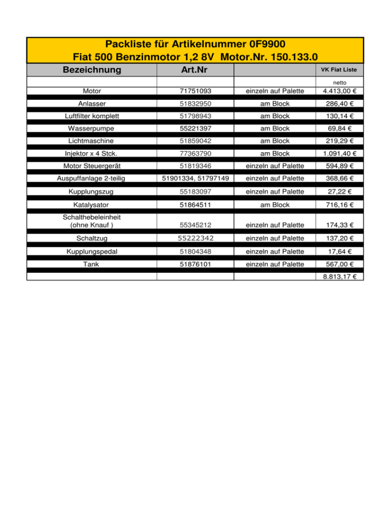 Packliste für Artikelnummer 0F9900 Fiat 500 Benzinmotor 1,2 8V Motor.Nr. 150.133.0 Bezeichnung Art.Nr Motor 71751093 einzeln auf Palette 4.413,00 € Anlasser 51832950 am Block 286,40 € Luftfilter komplett 51798943 am Block 130,14 € Wasserpumpe 55221397 am Block 69,84 € Lichtmaschine 51859042 am Block 219,29 € Injektor x 4 Stck. 77363790 am Block 1.091,40 € Motor Steuergerät 51819346 einzeln auf Palette 594,89 € Auspuffanlage 2-teilig 51901334, 51797149 einzeln auf Palette 368,66 € Kupplungszug 55183097 einzeln auf Palette 27,22 € Katalysator 51864511 am Block 716,16 € Schalthebeleinheit (ohne Knauf ) 55345212 einzeln auf Palette 174,33 € Schaltzug 55222342 einzeln auf Palette 137,20 € Kupplungspedal 51804348 einzeln auf Palette 17,64 € Tank 51876101 einzeln auf Palette 567,00 € VK Fiat Liste netto 8.813,17 € Packliste für Artikelnummer 0F9901 Fiat Fiorino 1,4B 8V 73PS 54KW MVS 2251L10 Bezeichnung Art.Nr. VK Fiat Liste Netto Motor 9467590280 5.075,88 Anlasser 71794532 138,37 Luftfilter komplett 51785907 142,32 Wasserpumpe 9631169188 66,99 Lichtmaschine 71793211 300,65 Injektor x 4 Stck. 9655251680 181,80 Motor Steuergerät 9666624380 655,49 Auspuffanlage 51804384/51804381/1400756180 708,89 Tank 51810262 456,69 7.727,08 Liste für baugleiche PSA-Teile Bipper / Nemo TU3A Bezeichnung Art.Nr. VK PSA Liste Netto Motor 0135PJ 4544,11 Lichtmaschine 80A 5705FC 206,14 Anlasser 5802EP 154,22 Injektor x 4 Stck. 1984G0 175,60 Wasserpumpe 1201G0 75,20 5155,27