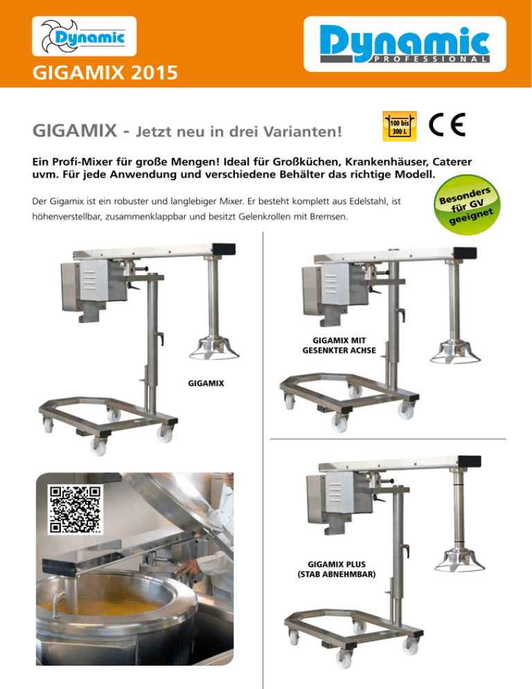 GIGAMIX 2015 GIGAMIX - Jetzt neu in drei Varianten! 100 bis 300 L Ein Profi-Mixer für große Mengen! Ideal für Großküchen, Krankenhäuser, Caterer uvm. Für jede Anwendung und verschiedene Behälter das richtige Modell. Der Gigamix ist ein robuster und langlebiger Mixer. Er besteht komplett aus Edelstahl, ist höhenverstellbar, zusammenklappbar und besitzt Gelenkrollen mit Bremsen. GIGAMIX mit gesenkter Achse GIGAMIX GIGAMIX Plus (Stab abnehmbar) rs nde Beso GV für t gne geei GIGAMIX 2015 Ihre Vorteile: NEUEIT • Komplett aus Edelstahl, Robust und langlebig • Für intensive Benutzung sehr gut geeignet • Zusammenklappbar, platzsparend Mixerglocke Zubehör Rührbesen komplett aus Edelstahl Elektrische Angaben: Anschlusswert 400 V, dreiphasig, 50 Hz Leistung 2,2 kW Drehzahl bis 4000 U/Min Magnetischer Thermoschalter • • Zubehör Turbostab • Technische Angaben Stablänge Mixstab 570 mm Durchmesser Glocke 270 mm Gesamtmaße Maße ausgeklappt L x B x H cm 170 x 60 x 120 cm 170 x 60 x 130 cm 170 x 60 x 120 cm Maße zusammengeklappt L x B x H cm 95 x 60 x 170 cm 95 x 60 x 150 cm 95 x 60 x 170 cm Gewicht 79 Kg Minimum Abstand vom Boden 500 mm 250 mm 500 mm Maximum Abstand vom Boden 790 mm 540 mm 790 mm = Differenz Zubehör Kugelförmiger Rührbesen Der neue Rührbesen für den Gigamix ist ideal für die Zubereitung Ihrer Flockenpürees, Suppen... Dieser Rührbesen ermöglicht eine homogene und perfekte Mischung. Für die Benutzung des Rührbesens wird die Drehzahlregulierung vorausgesetzt. 06 1700 mm 05 290 mm Zubehör Turbostab Das Emulgierwerkzeug für feinste Suppen und Soßen. Auch geeignet für die Herstellung spezieller kaltquellender Soßen. Neuer al Turbostab, ide n zum Emulgiere und Mixen Drezahlregulierung 0 bis 4000 U/Min (Option) 60 0m m www.dynamic-professional.de
