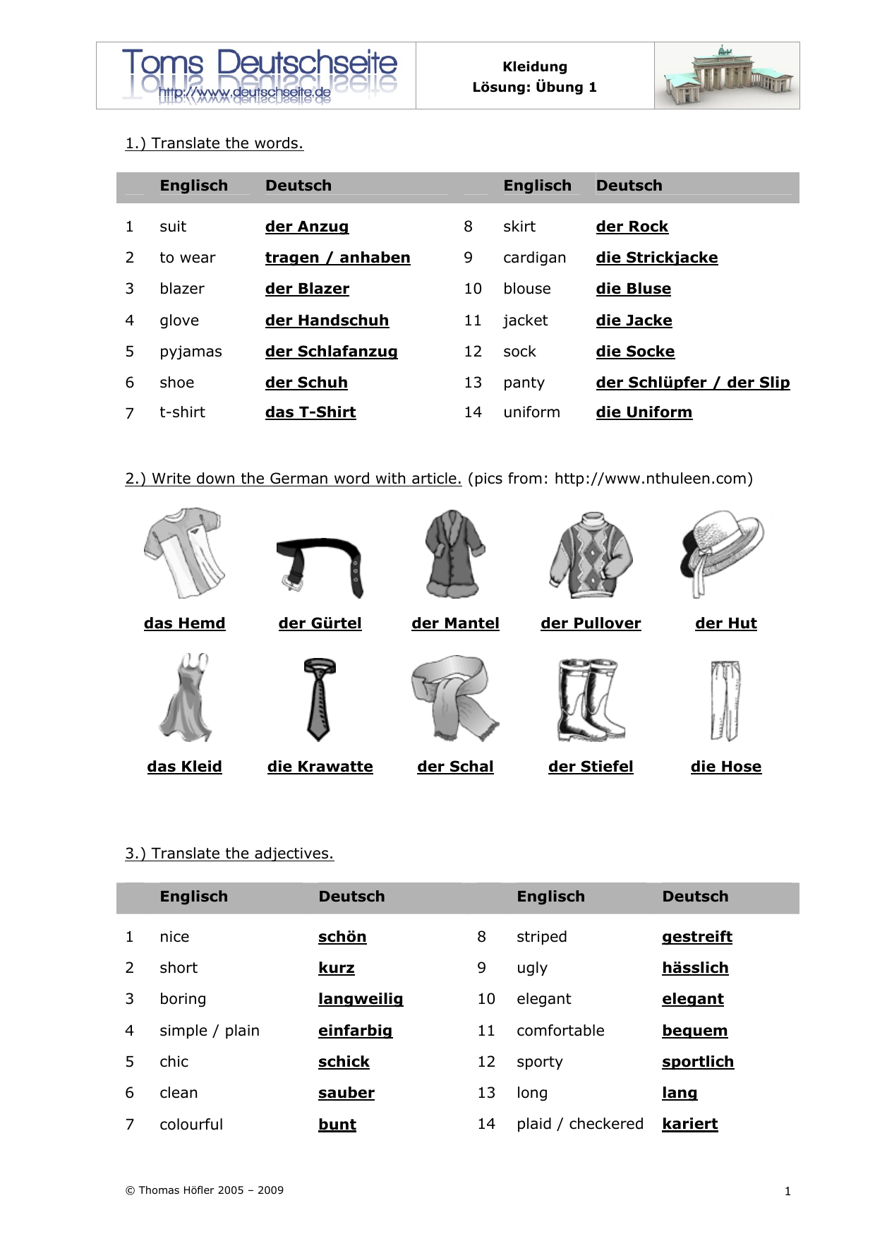 1.) Translate the words. Englisch Deutsch Englisch Deutsch 1 suit